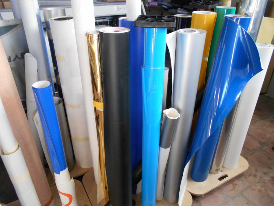 Lotto 88, 86) BOBINE PVC circa 360 rotoli vari tipi e formati, alcune nuove, la maggior parte utilizzate, espositore porta rotoli.