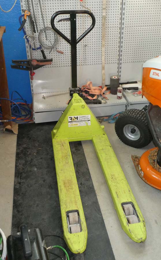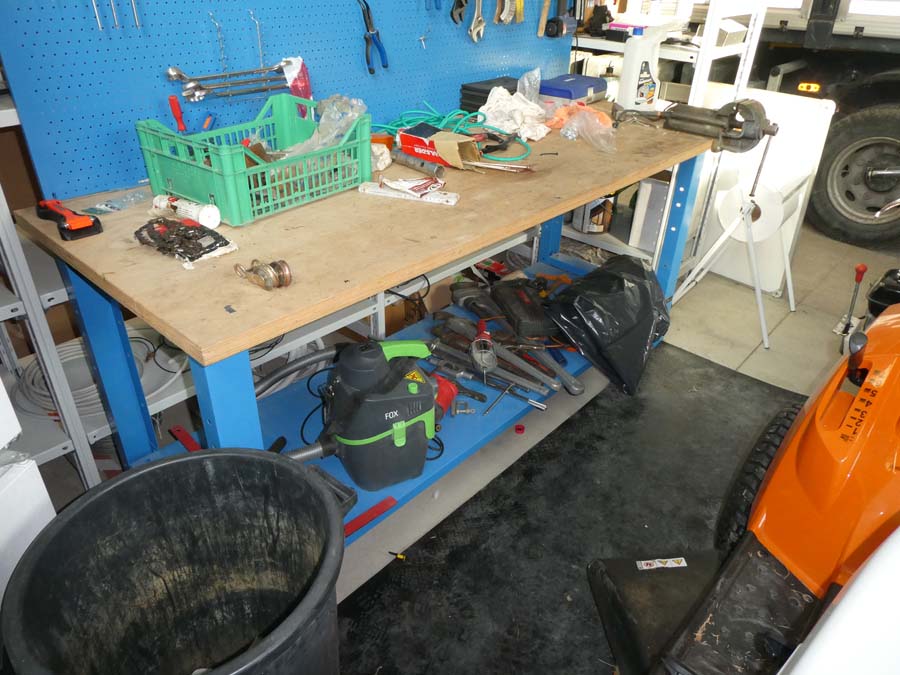 Rif. 8+12+13+22+23 : Traspallet di colore verde; Frigo a due ante provvisto di congelatore; Banco in metallo e legno provvisto di morsa e rastrelliera con utensili vari; Scala in alluminio; Carrello in acciaio.