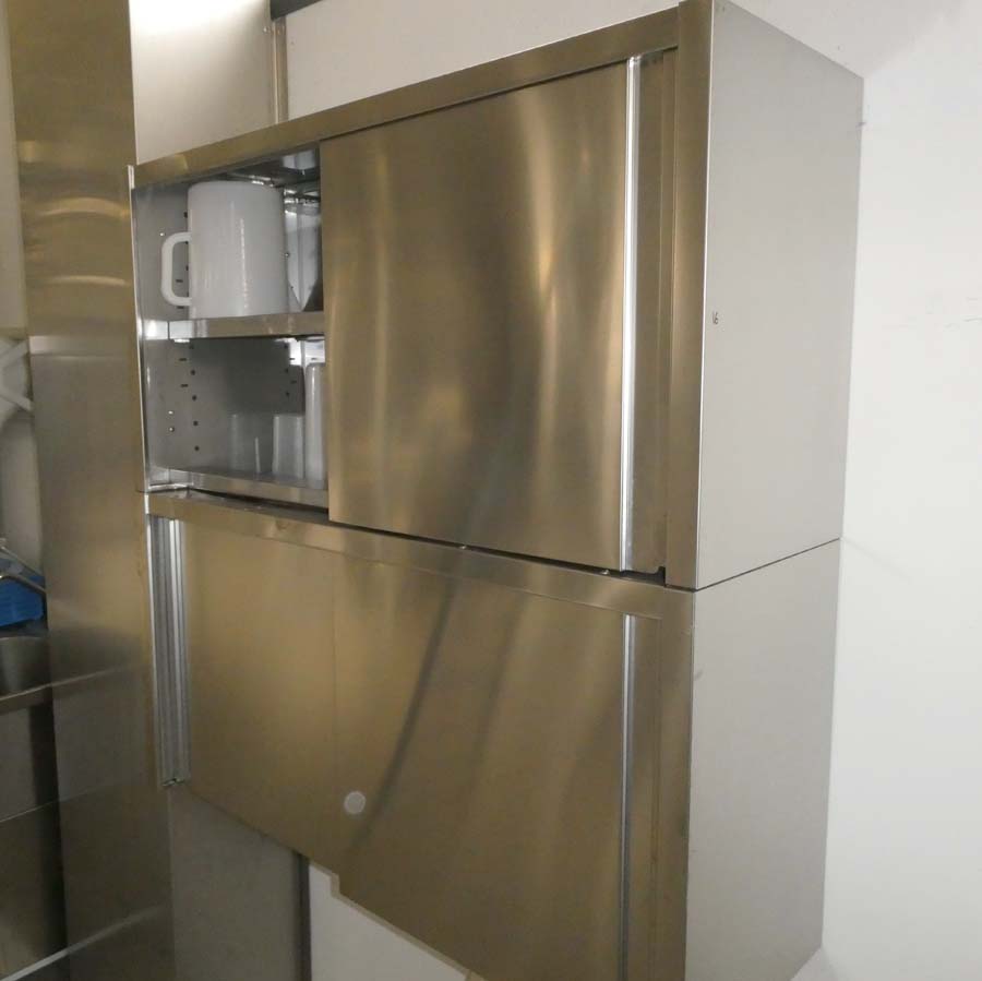 Lotto 16) N. 2 pensili a parete in acciaio inox con ante scorrevoli, all’interno dosatori e vasetti in vetro.