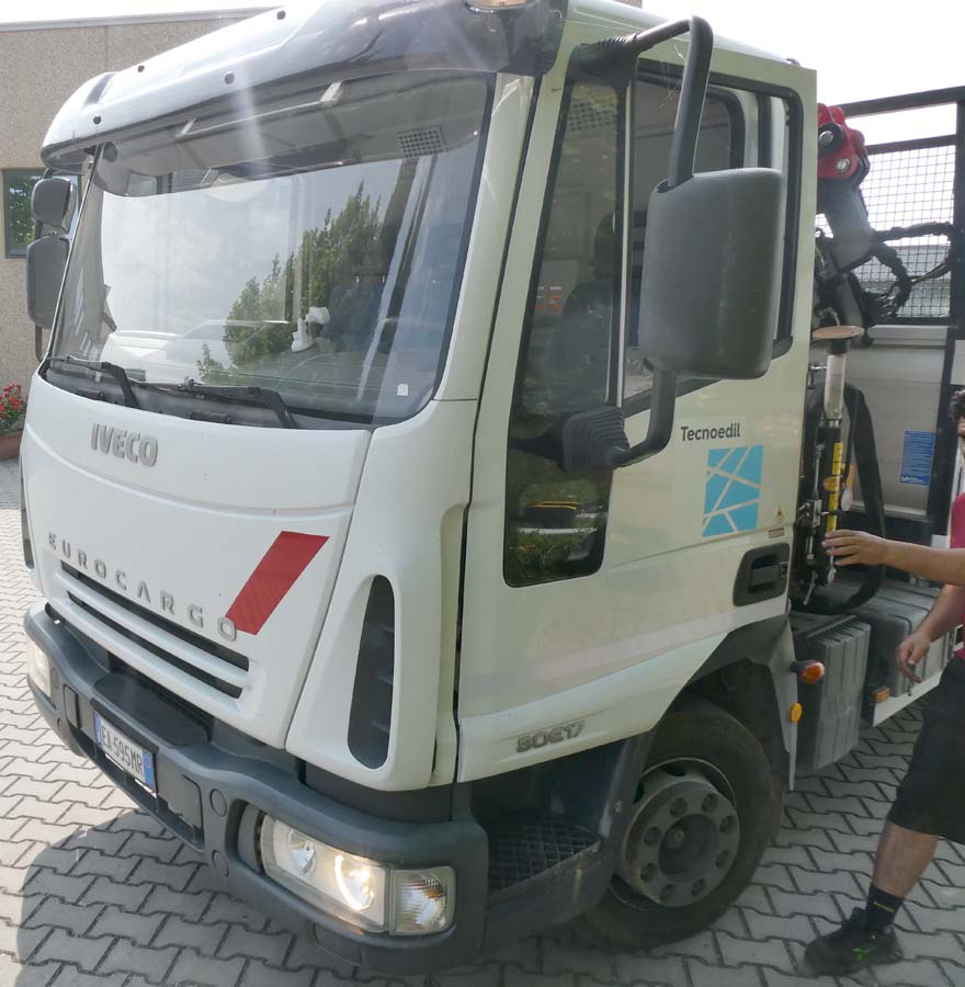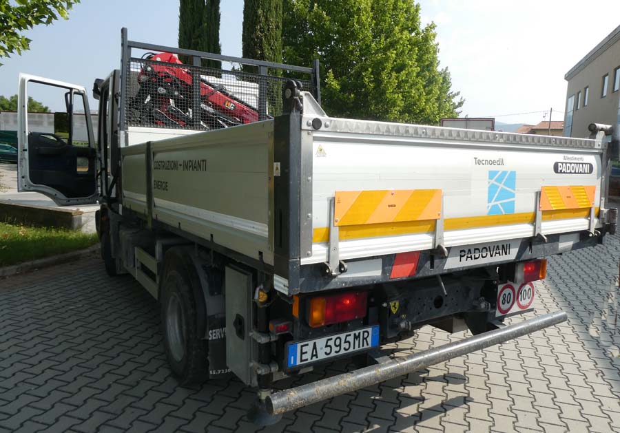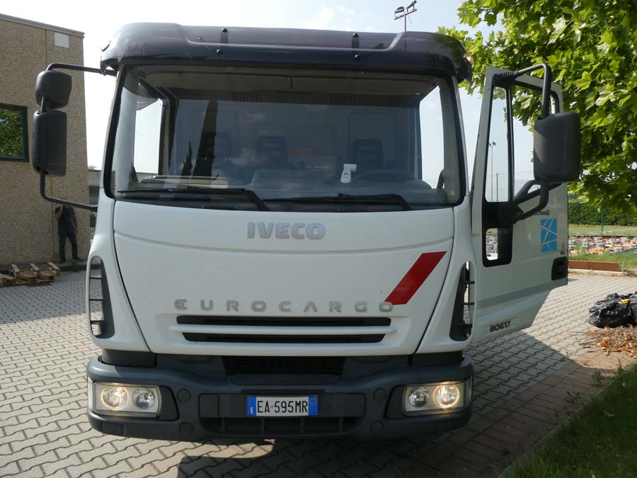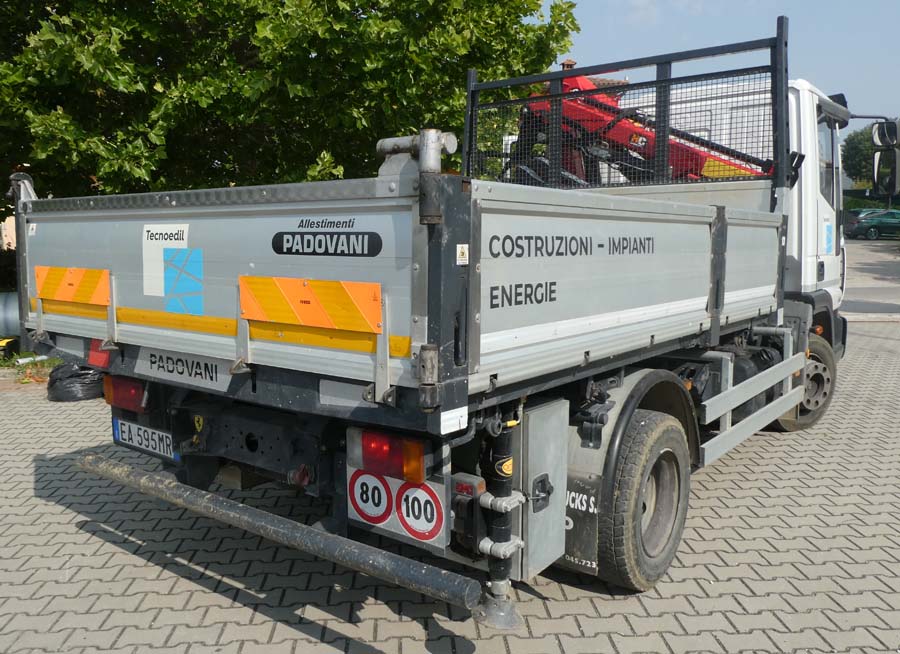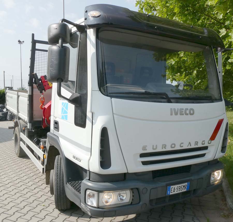 Autocarro Iveco EuroCargo 80E17 Tg. EA595MR, provvisto di gru (anno 2024) e cassone ribaltabile, data di immatricolazione 30/08/2006, Kw. 125, cc 3920, alimentazione a gasolio, chilometraggio da tachimetro 207.000 circa.