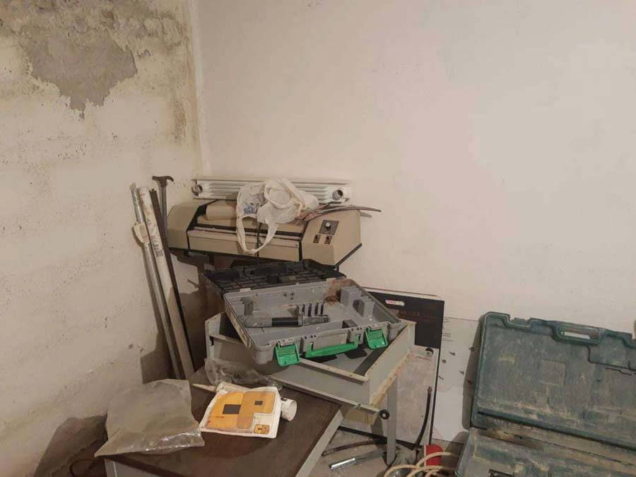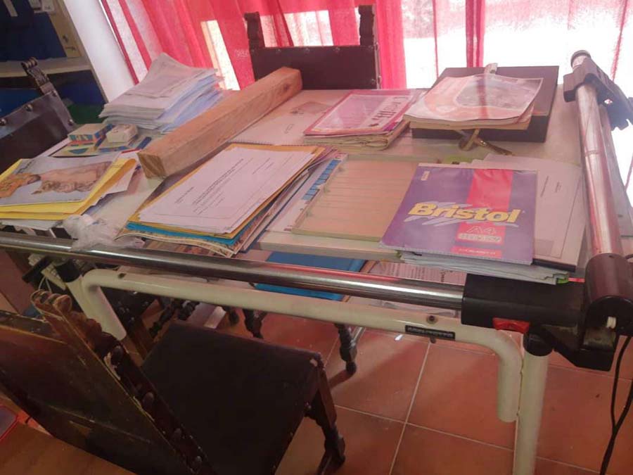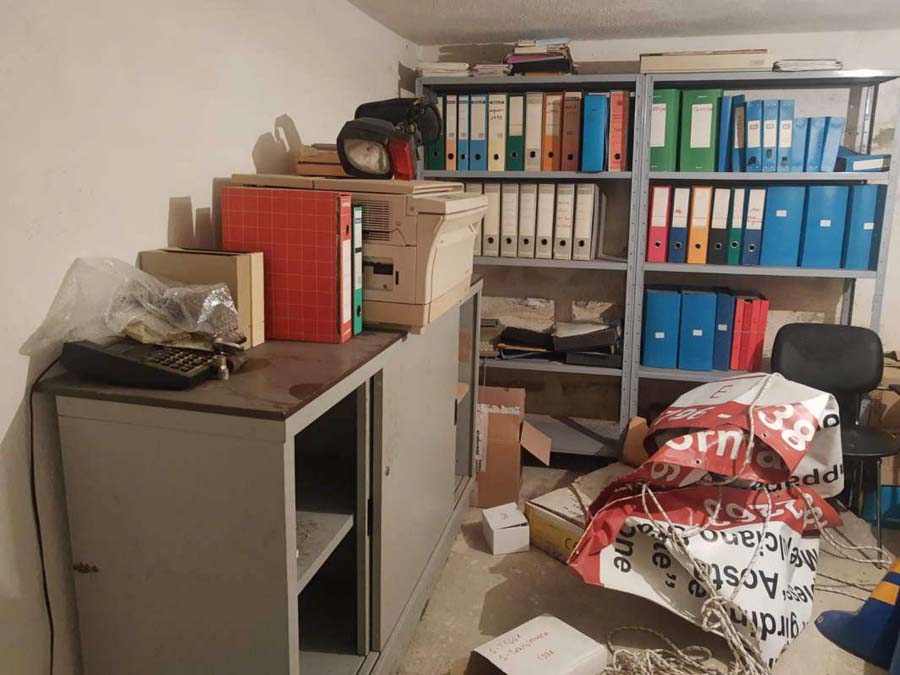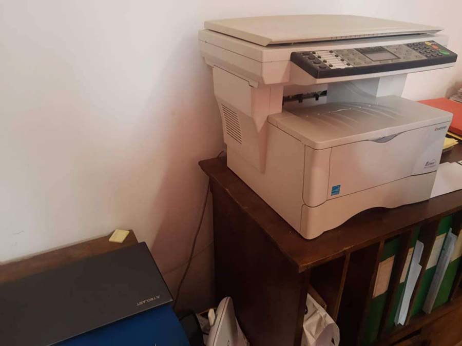 Lotto 1, 2, 3, 4, 5, 7, 8, 9, 11, 12, 13, 14, 15, 16, 17, 18, 19, 20, 21, 22) ARREDO DA UFFICIO composto da: Mobile legno massello tipo “arte povera” dotato di 4 sportelli bassi e porta cartelle superiore, Mobile legno massello tipo “arte povera” dotato di 4 sportelli bassi e porta cartelle superiore, fotocopiatrice KIOCERA mod. FS 1118 MFP, tavolo dattilo in legno massello con cassetto, telefono e fax, PC, scrivania in legno massello due sportelli e cassetto, poltroncina girevole in similpelle nera, divano in pelle bianco a due sedute, divano in tessuto chiaro due sedute, n. 7 poltroncine in pelle e intelaiatura in legno, tavolinetto in legno, libreria in massello 4 ripiani e sportelli, tavolo da disegno tecnico NEOLT mod. GL, libreria in laminato bianco e 2 sportelli, appendiabiti in acciaio cromato base marmo, mobile angolo in legno 5 ripiani, mobile vetrina in alluminio con illuminazione, poltrona girevole similpelle con braccioli, tritadocumenti.