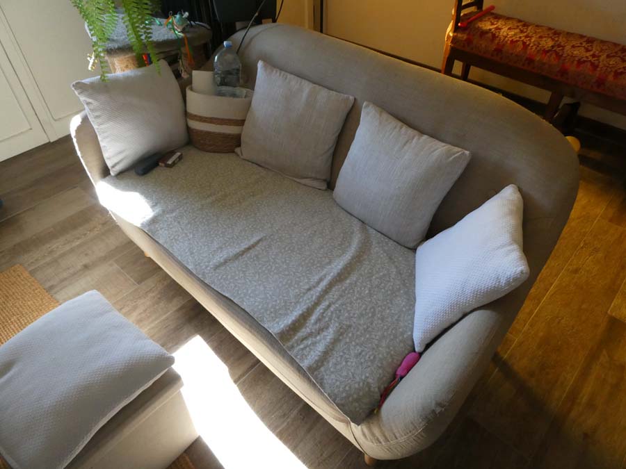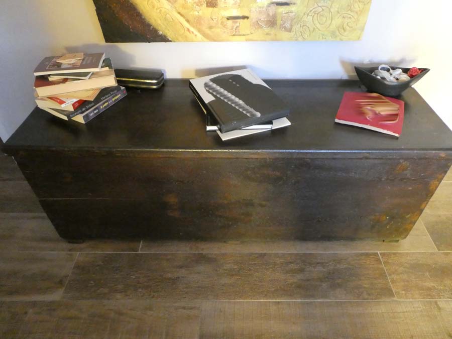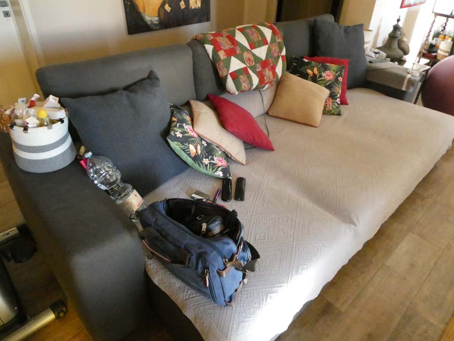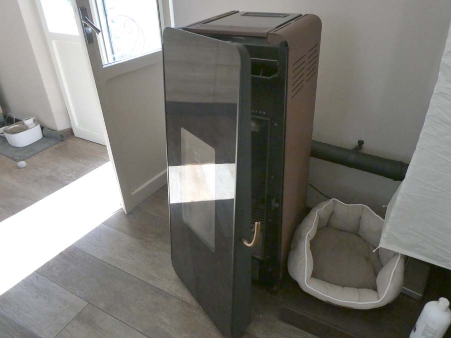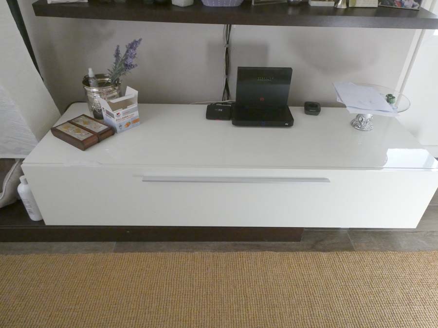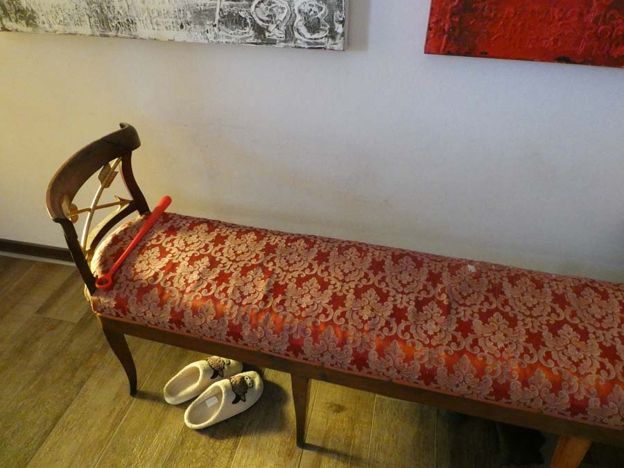 Televisore marca LG maxischermo; stufa a pellet Caminetti Montegrappa; divano a 3 posti in stoffa grigia; divanetto in stoffa a 2 posti: cassapanca in legno; divanetto in stoffa damascata bordeaux; mobile basso colore crema; n. 2 quadri uni rosso ed uno bianco.