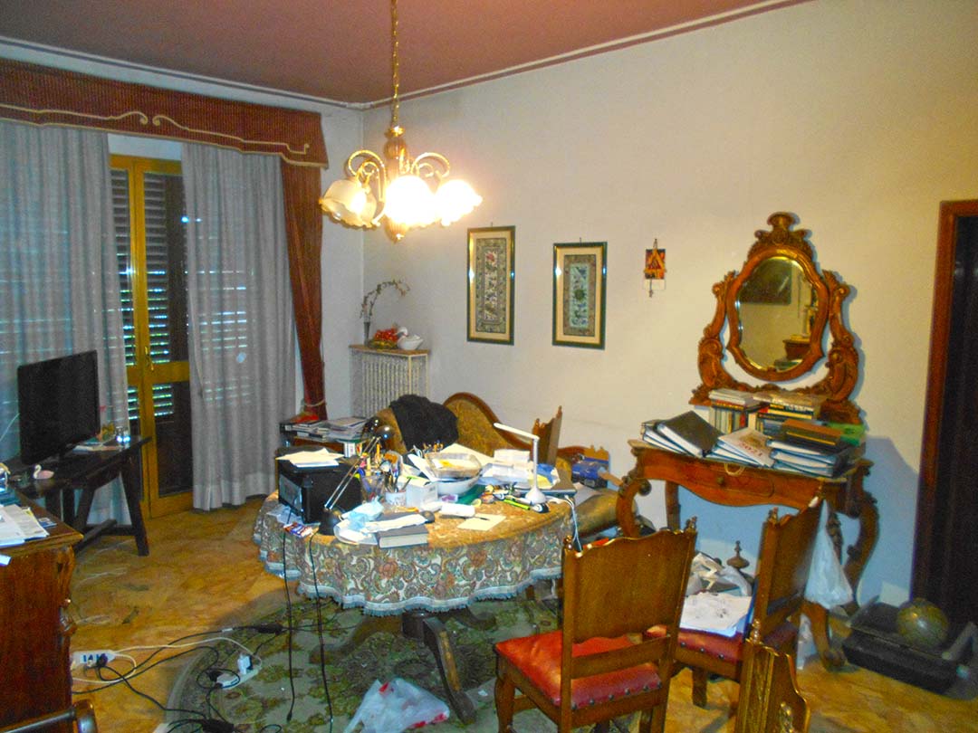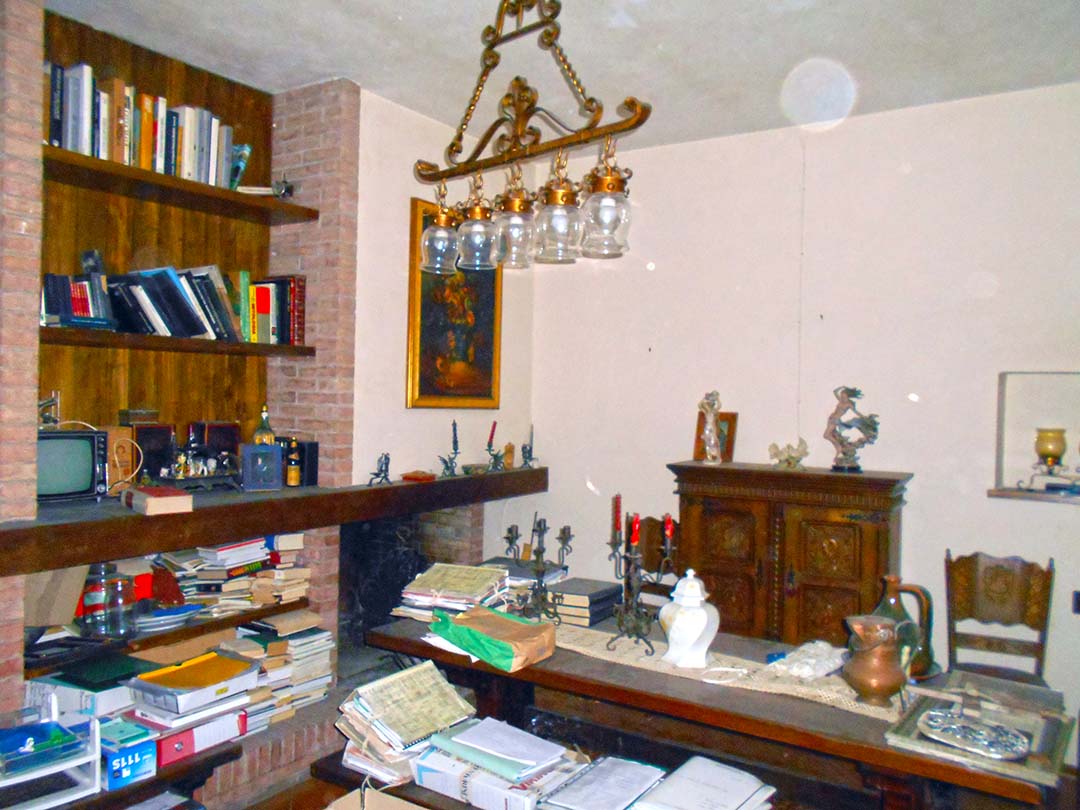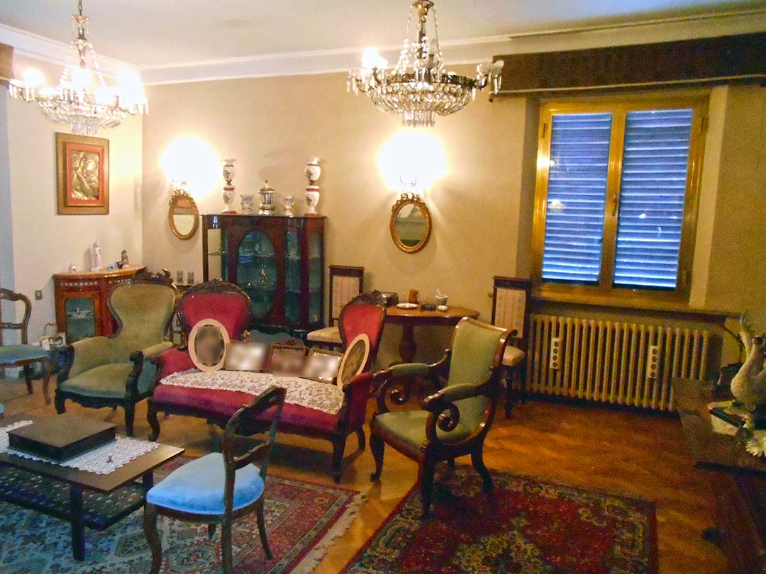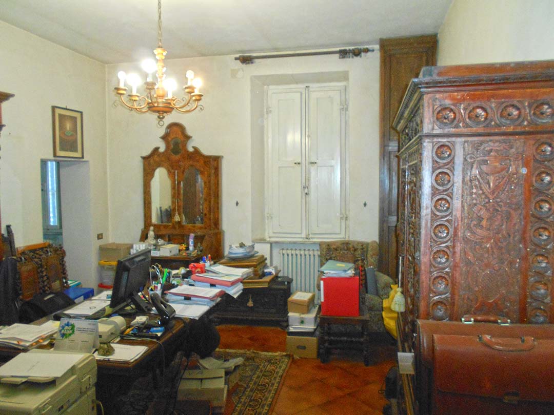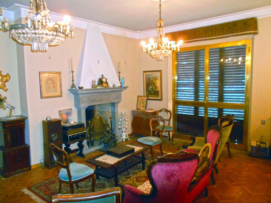 Appartamento (mq 397) al primo piano composto da ingresso, cucina, terrazzo, locale pluriuso, studio, soggiorno con camino (con altro terrazzo), disimpegno, stireria, tre camere, due bagni, salone, sala da pranzo con camino ed a un’altra cucina con ripostiglio.