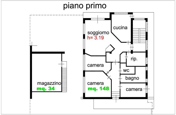 - appartamento di civile abitazione al piano primo, composto da: disimpegni, cucina, soggiorno, tre camere, due bagni, ripostiglio e terrazze, integrato da locale magazzino.