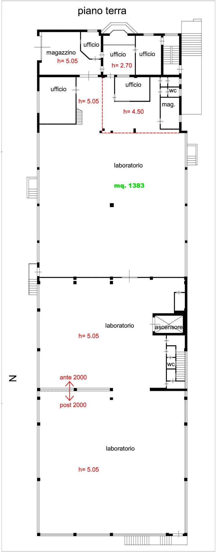 - unità immobiliare ad uso produttivo composta da: nove locali magazzino, garage, locale compressori, due locali centrale termica, locale centrale elettrica, servizi, piccoli vani accessori, al piano seminterrato; tre ampi vani adibiti a laboratorio, cinque uffici, due magazzini e servizi, al piano terra, collegato al piano sottostante tramite scale interne e ascensore;