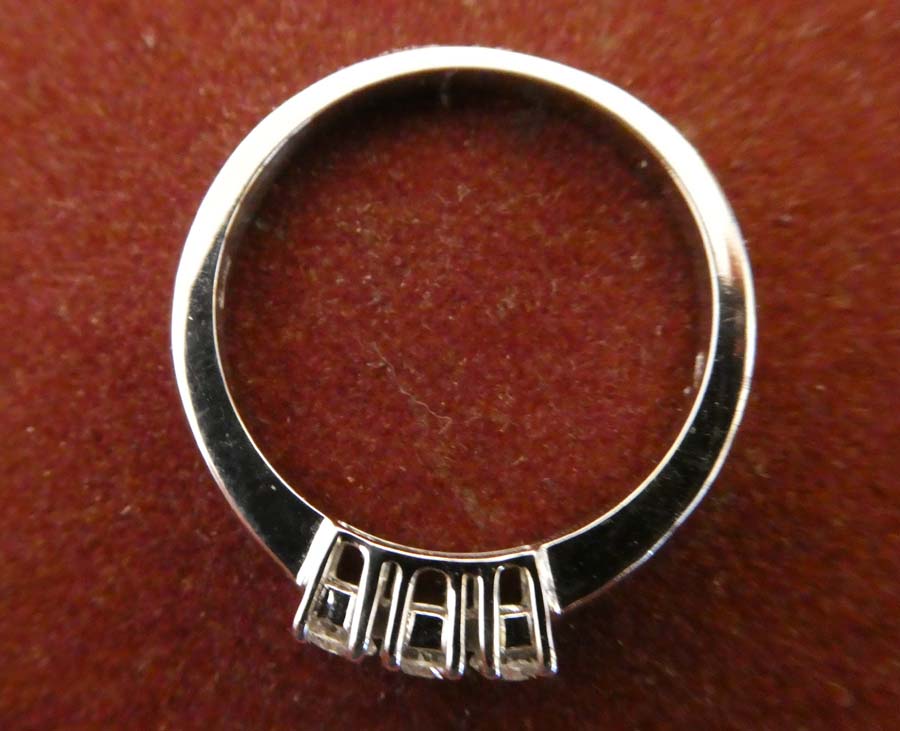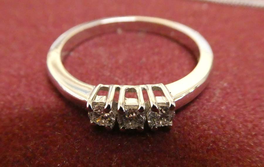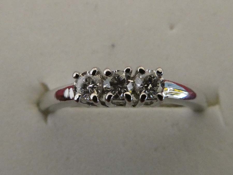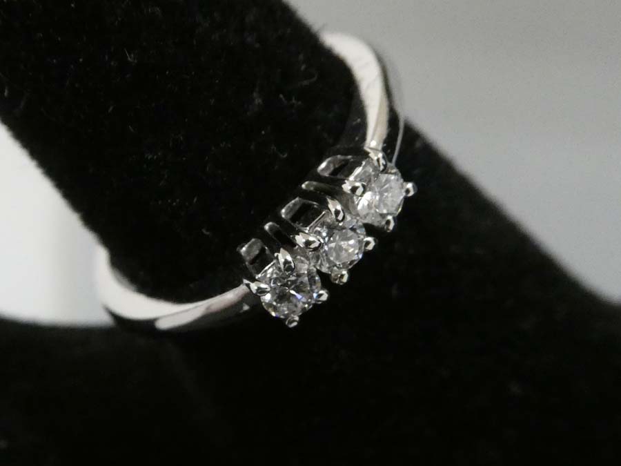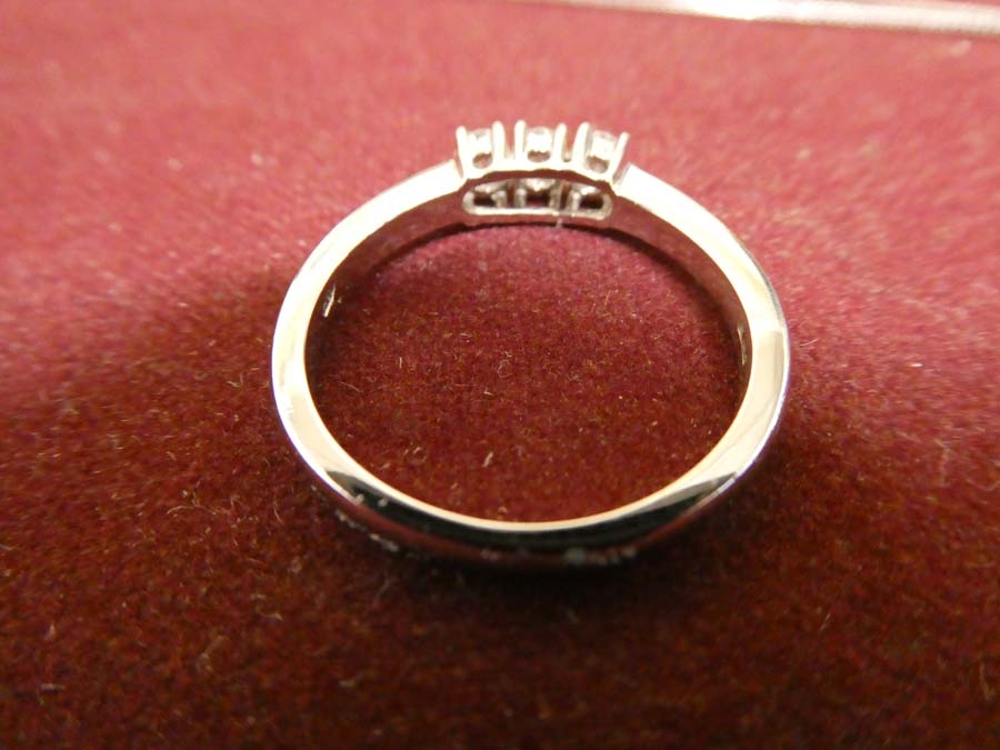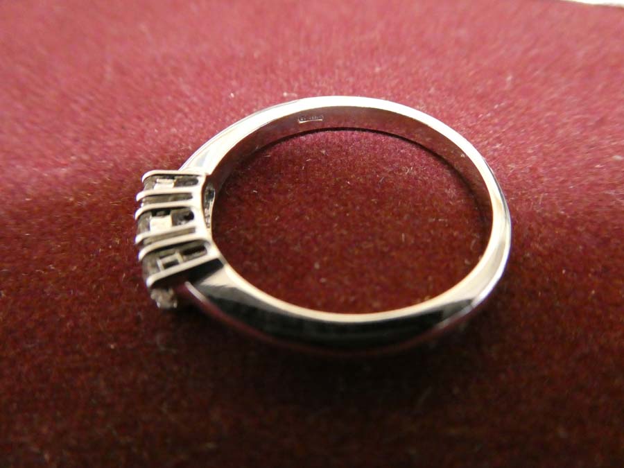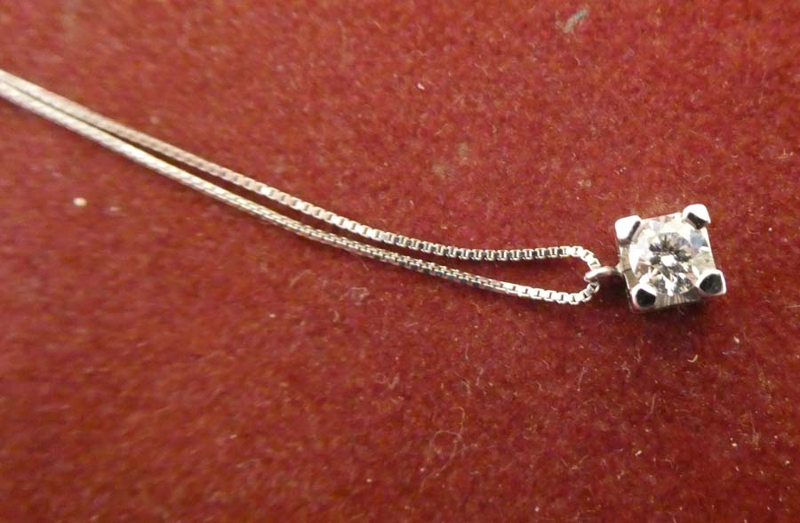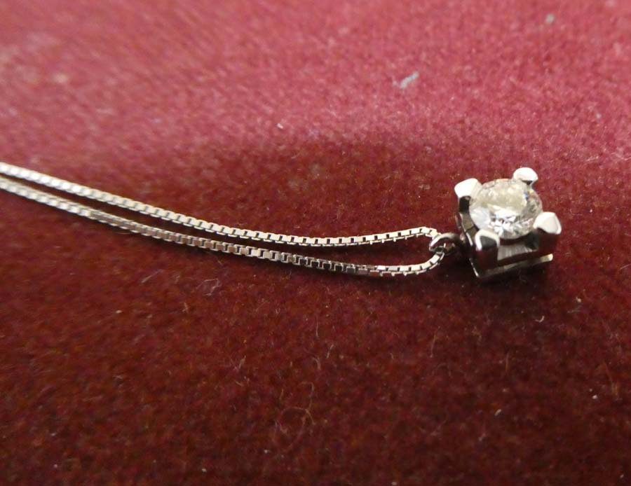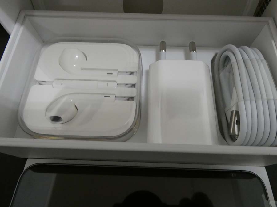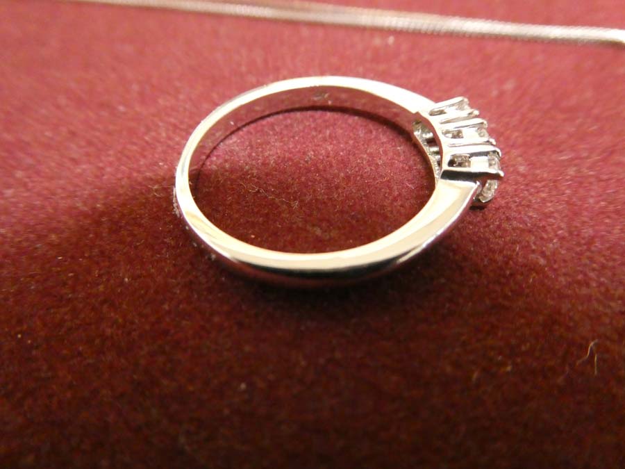 Una catenina in oro bianco con pendente, anello in oro bianco tipo trilogy e un iPhone 5s. , peso totale dei monili gr. 5, lunghezza catena 40 cm, misura anello 8, entrambi gli oggetti sono completi di pietre semipreziose, telefono cellulare aperto ma nuovo con pellicola sullo schermo e accessori.