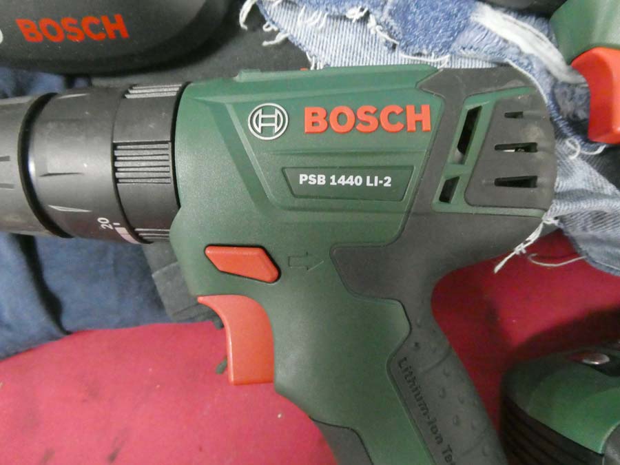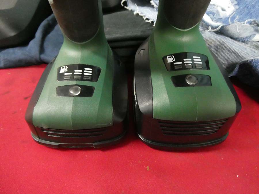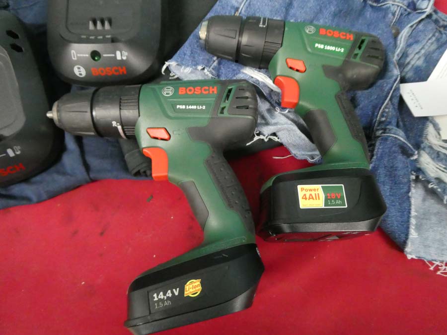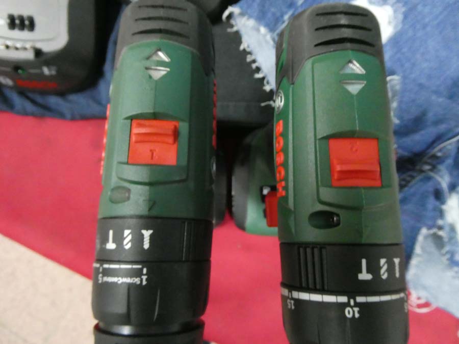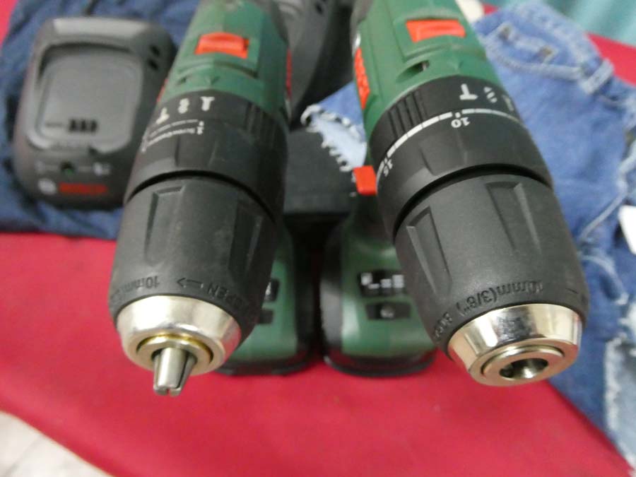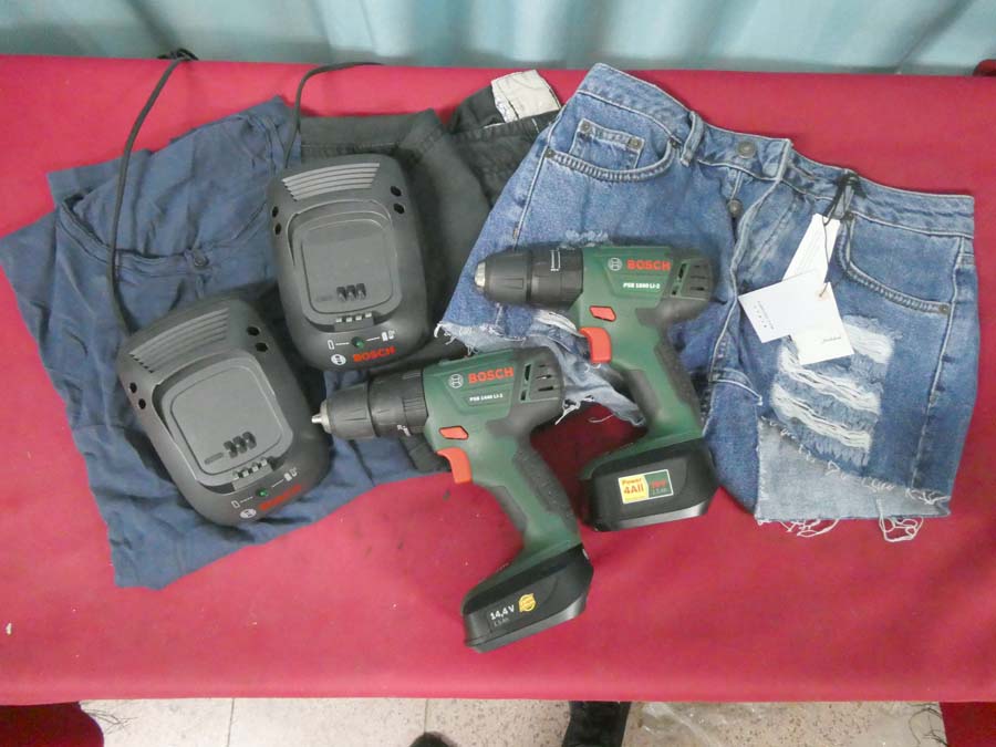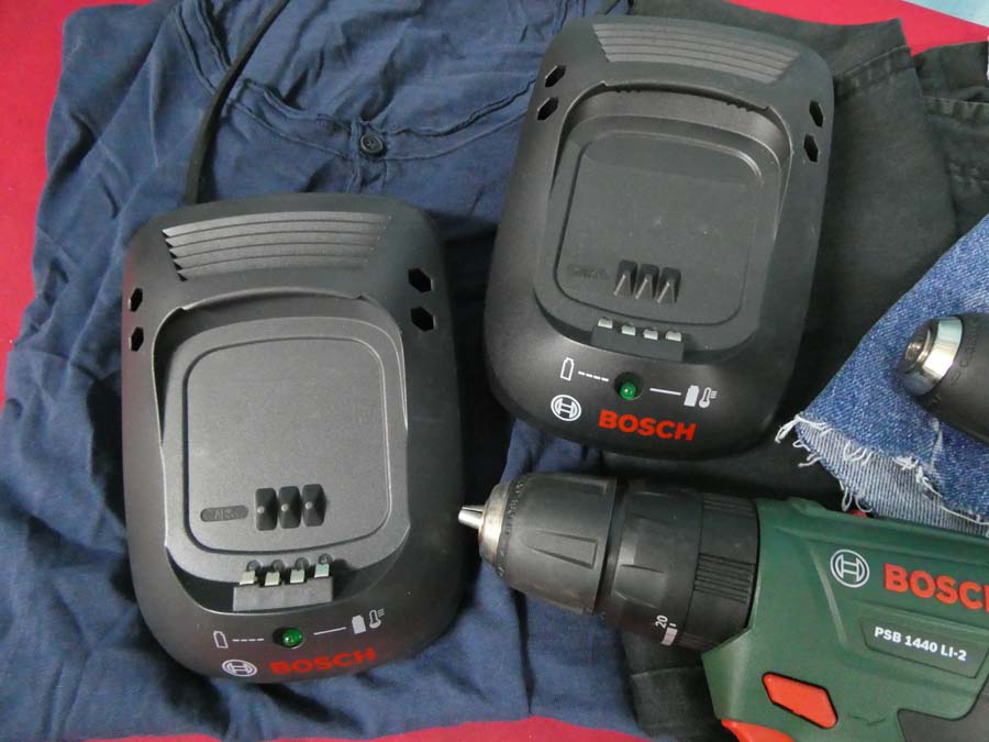 N. 2 avvitatori marca Bosch mod. PSB 1440 LI-2 E Mod. 1800 LI-2, buone condizioni, con i relativi caricabatterie + n. due paia di pantaloni + maglia.