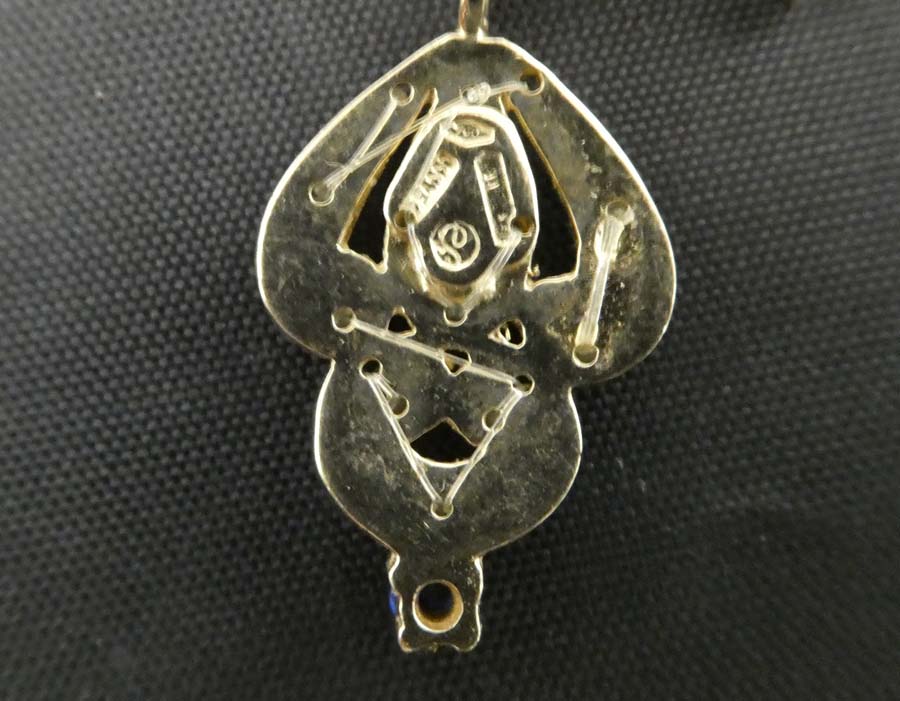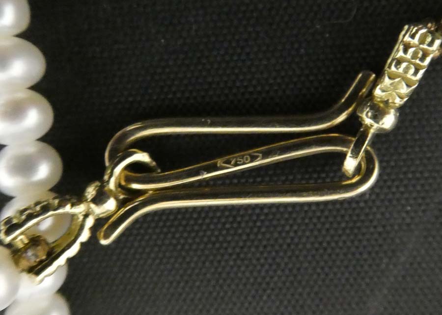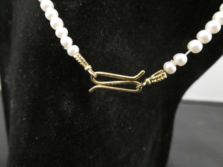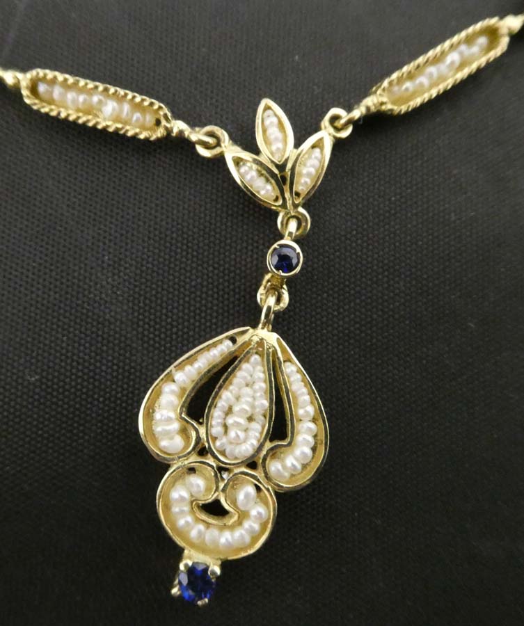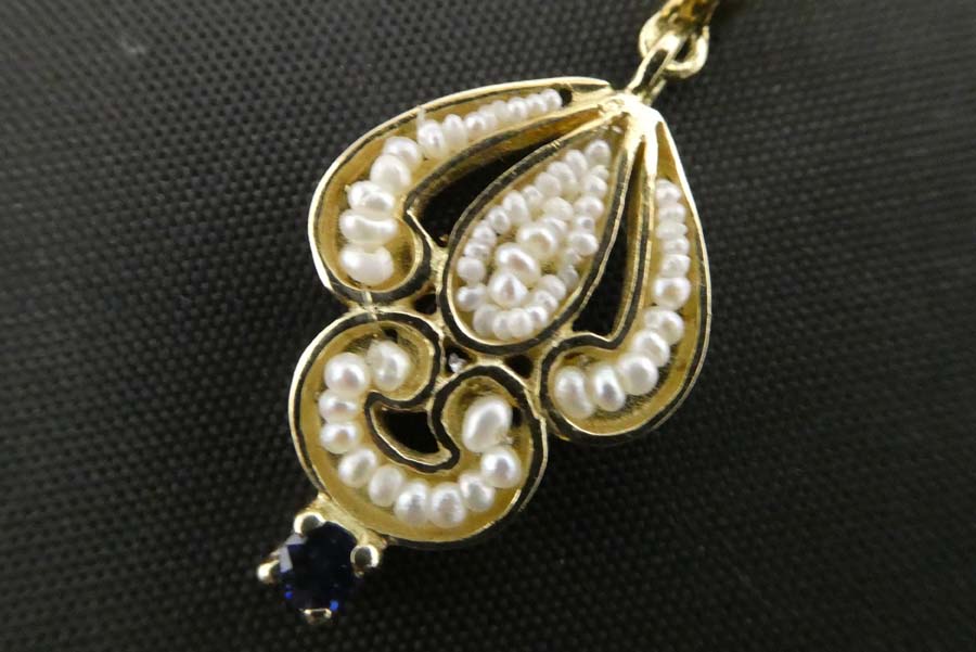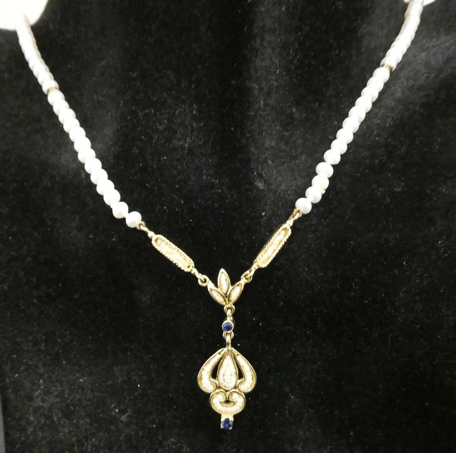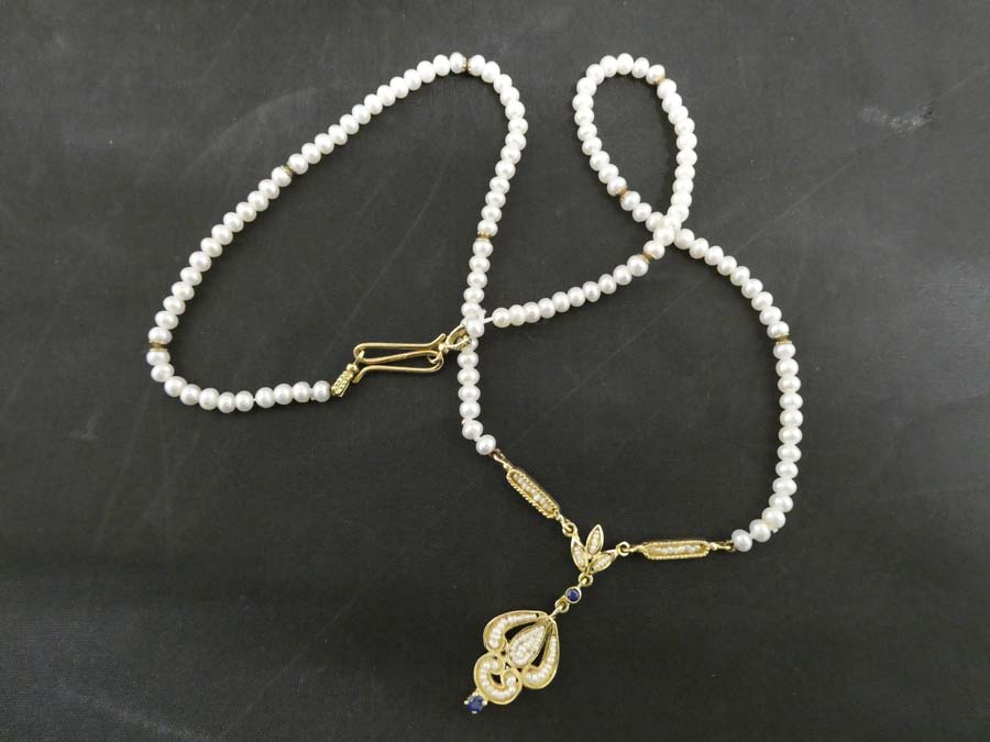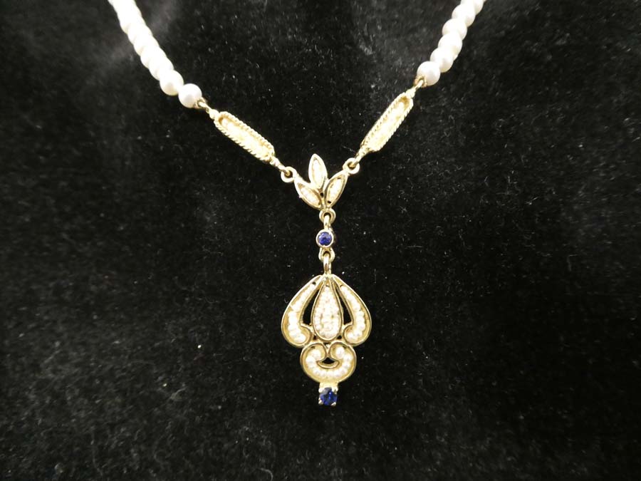 Collana di perle, non certificate, con ciondolo e chiusura in oro e pietre dure blu sempre sul ciondolo, lunghezza totale 46 cm.