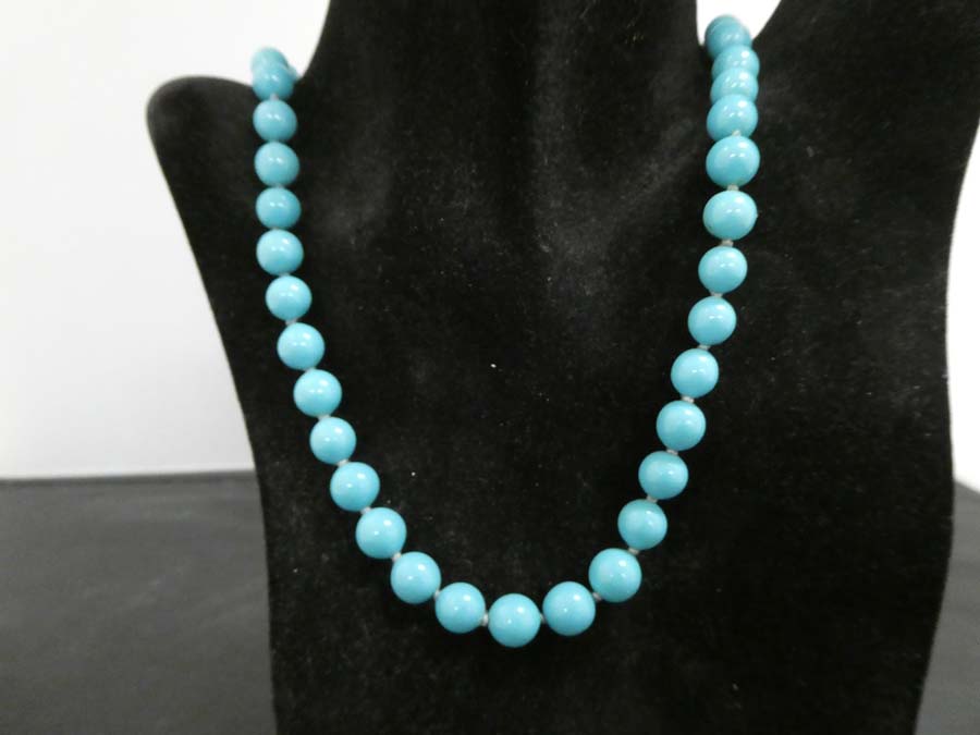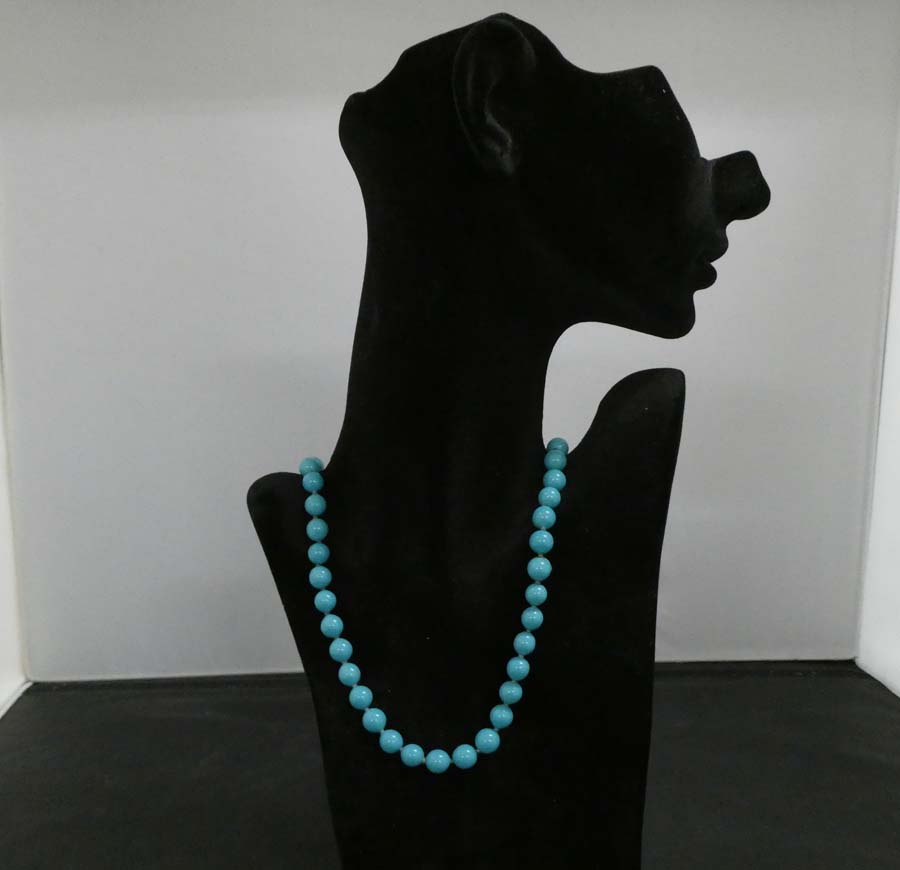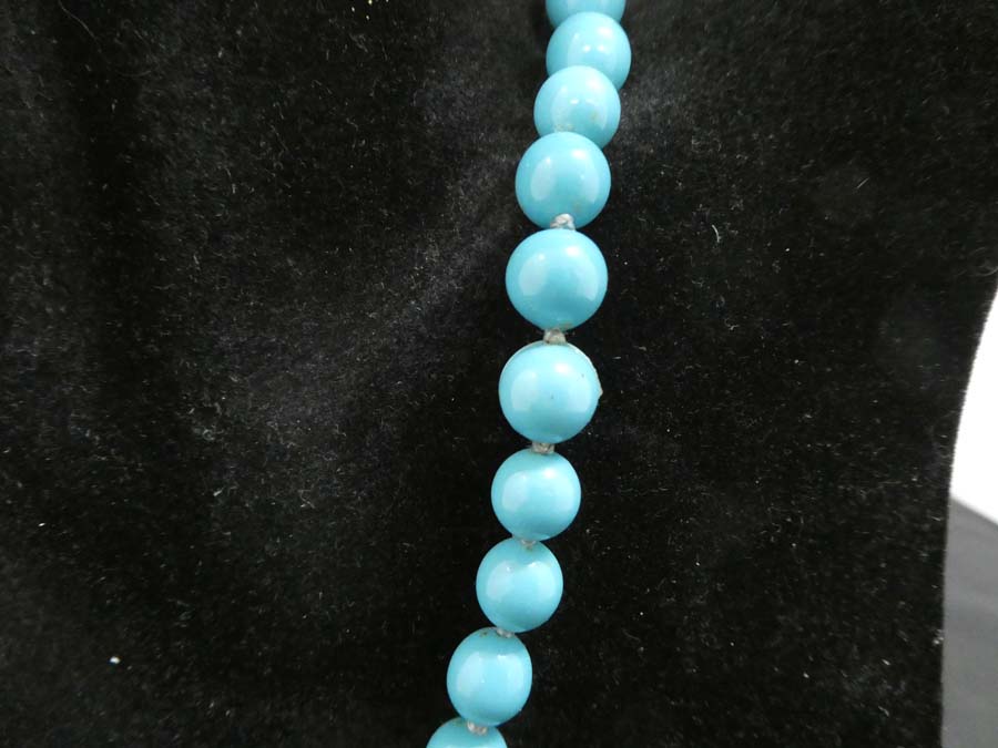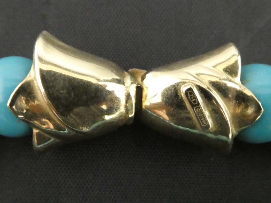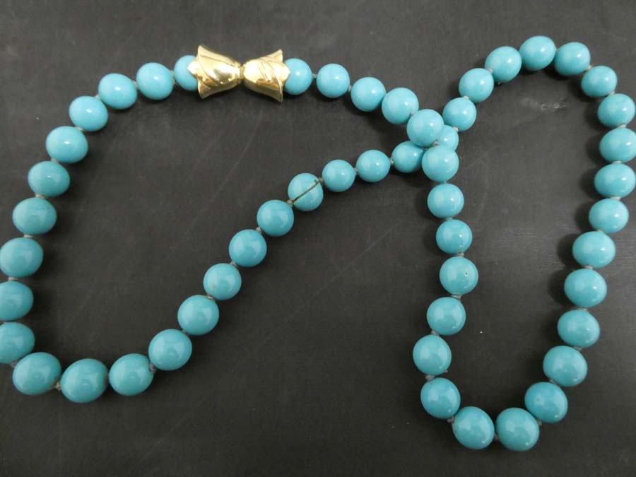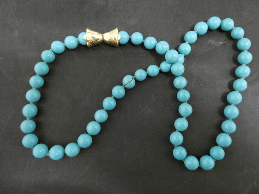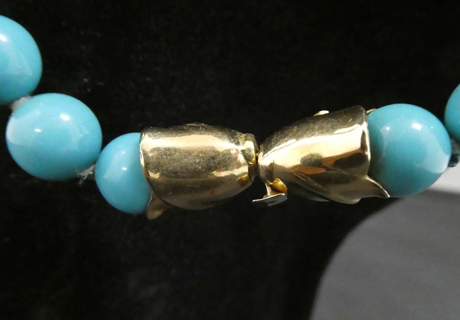 Collana in pietre dure sferiche, turchese non certificato, con chiusura in oro, lunghezza totale 57 cm, si evidenzia una gemma incrinata.