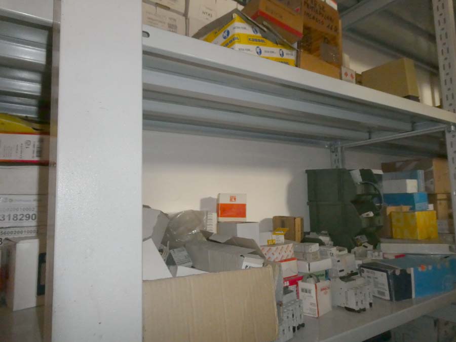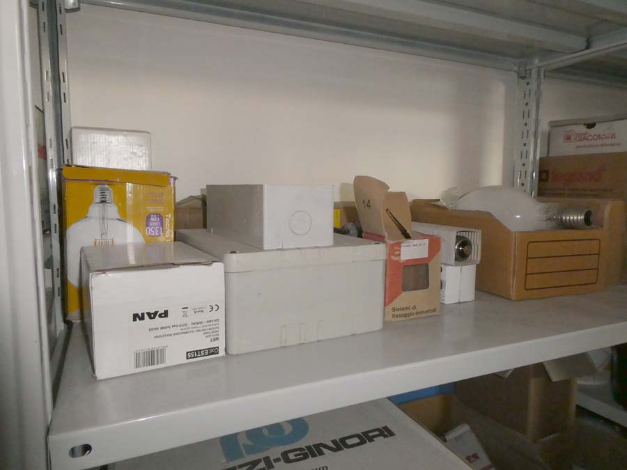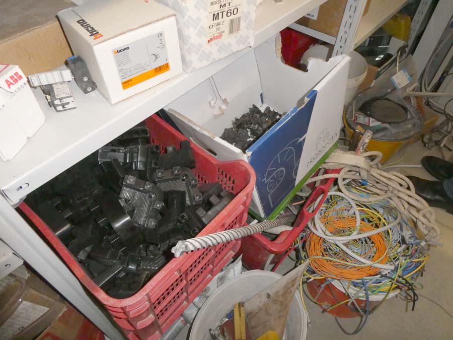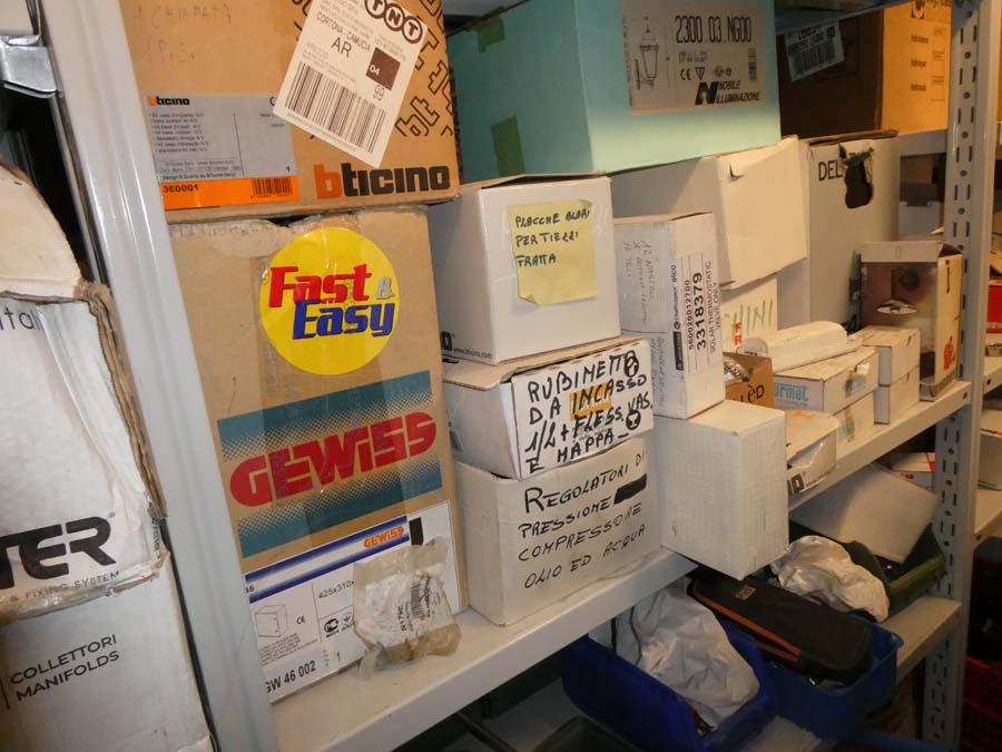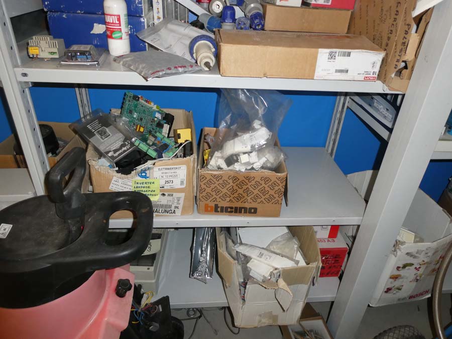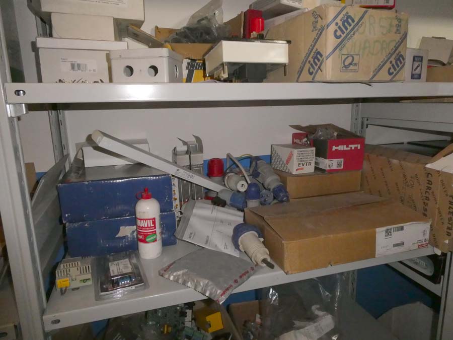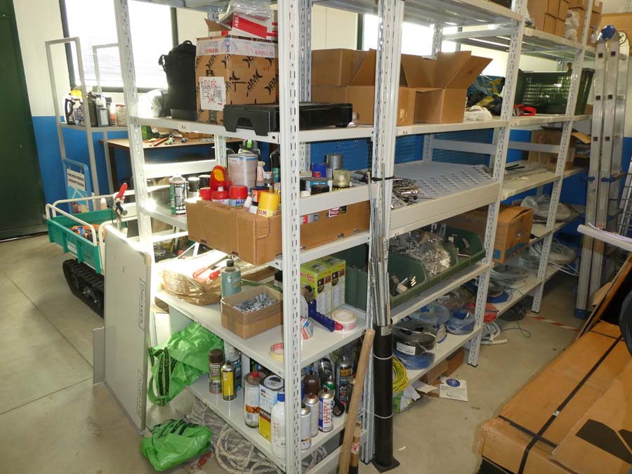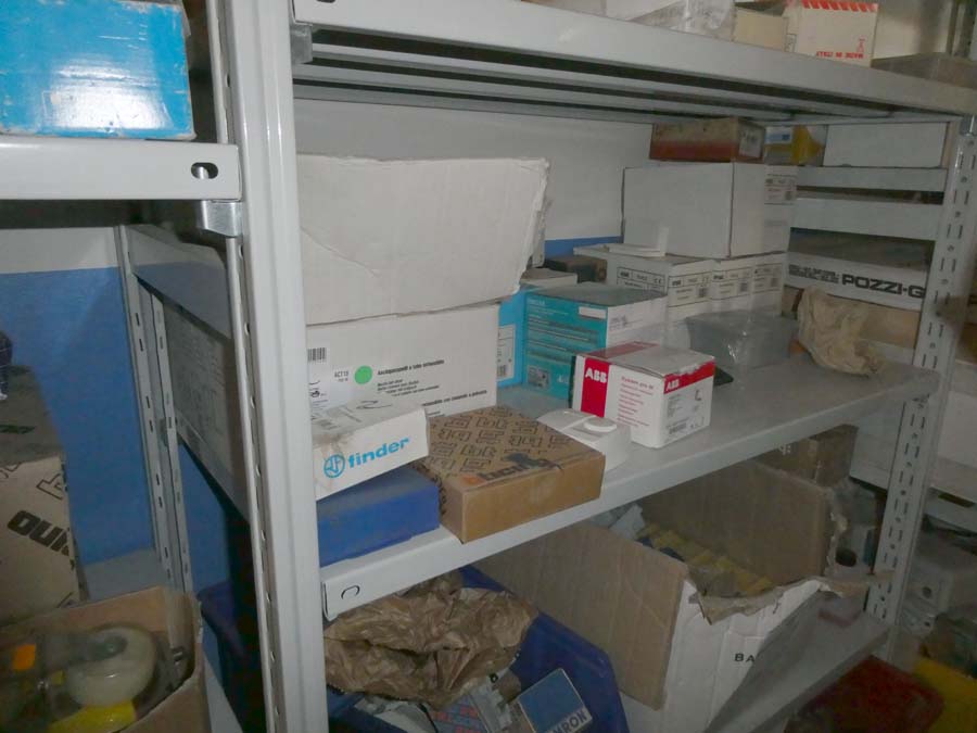 Rif. 1+2+11+15+19+20+28+46 : Scaffalatura contenente prodotti lubrificanti ed altro, usati; Banco in ferro; Doppia scaffalatura espositiva contenente accessori vari; Scaffalatura ad “L” contenente prodotti usati, cavi, staffe, barre, cinghie ed interruttori; Scaffalatura di una lunghezza di circa 10 metri lineari, contenente raccordi, cerniere, flessibili, curve in rame, galleggianti, modulari e apparecchiature elettriche, il tutto in quantità modeste; Scaffalatura di una lunghezza di circa 9 metri lineari contenenti modulari, accessori per impianti di allarme, interruttori, spine, prese, lampade, accessori vari di recupero, solventi vari da smaltire; Scaffalatura 6 metri lineari, contenente lampade, refrigeratori gas e altri vari oggetti; Scaffalatura di circa 6 metri lineari contenente, split, aspiratore, pressa cavi, scatole, centralina, bulloneria assortita, materiale vario in disuso, viti ed altro.