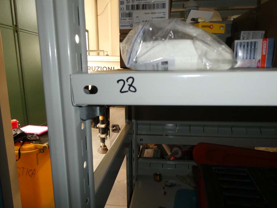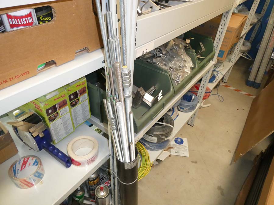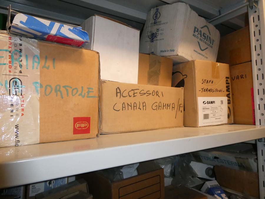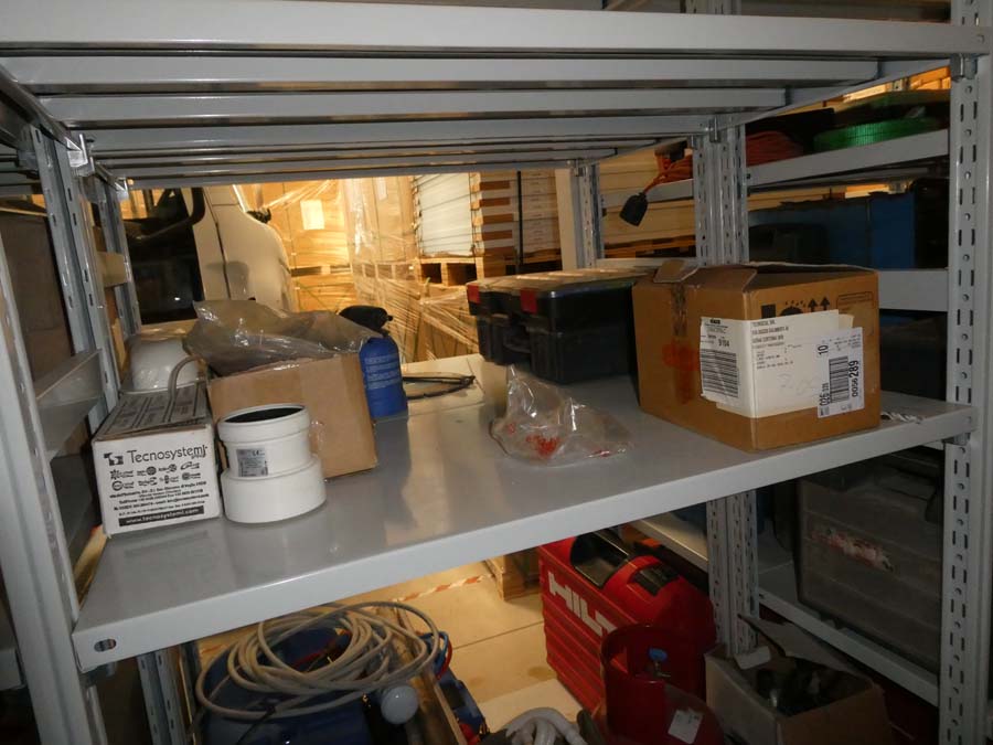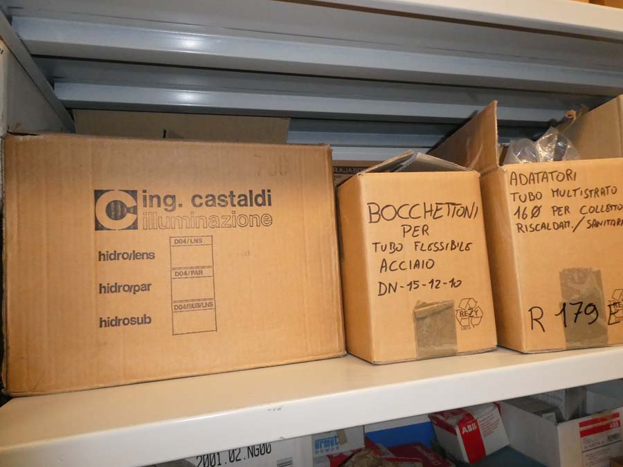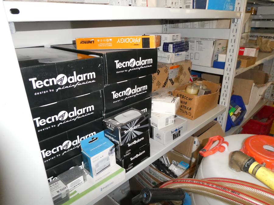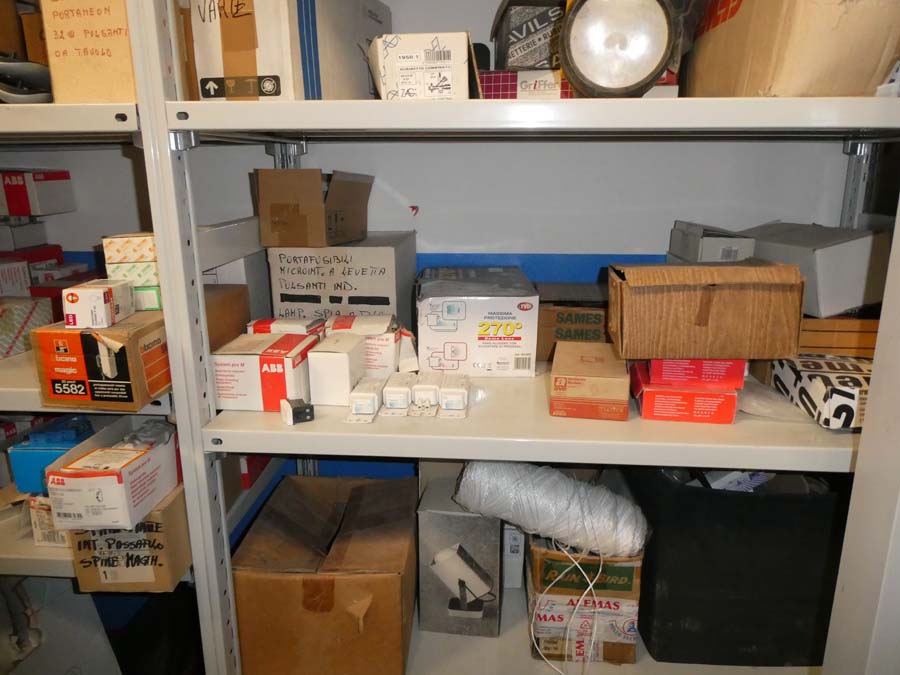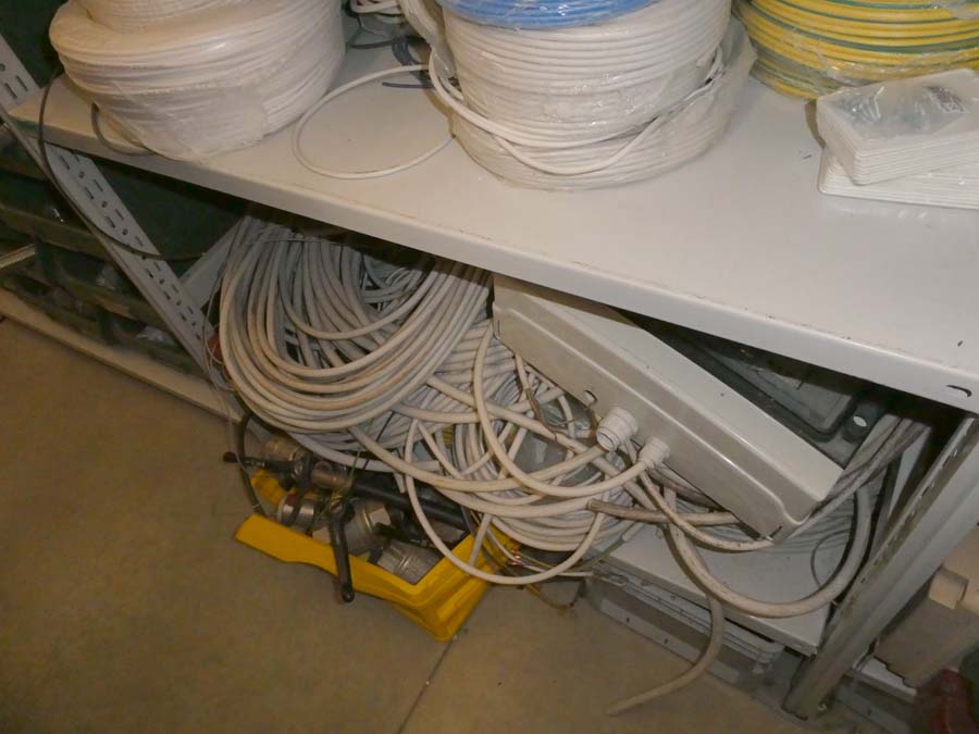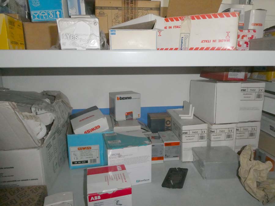 Rif. 1+2+11+15+19+20+28+46 : Scaffalatura contenente prodotti lubrificanti ed altro, usati; Banco in ferro; Doppia scaffalatura espositiva contenente accessori vari; Scaffalatura ad “L” contenente prodotti usati, cavi, staffe, barre, cinghie ed interruttori; Scaffalatura di una lunghezza di circa 10 metri lineari, contenente raccordi, cerniere, flessibili, curve in rame, galleggianti, modulari e apparecchiature elettriche, il tutto in quantità modeste; Scaffalatura di una lunghezza di circa 9 metri lineari contenenti modulari, accessori per impianti di allarme, interruttori, spine, prese, lampade, accessori vari di recupero, solventi vari da smaltire; Scaffalatura 6 metri lineari, contenente lampade, refrigeratori gas e altri vari oggetti; Scaffalatura di circa 6 metri lineari contenente, split, aspiratore, pressa cavi, scatole, centralina, bulloneria assortita, materiale vario in disuso, viti ed altro.