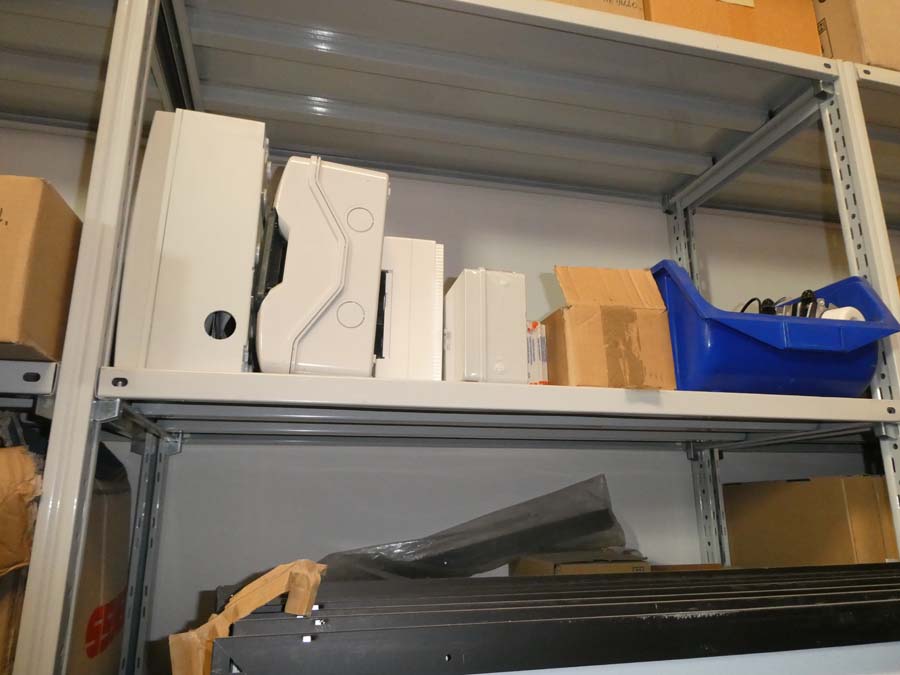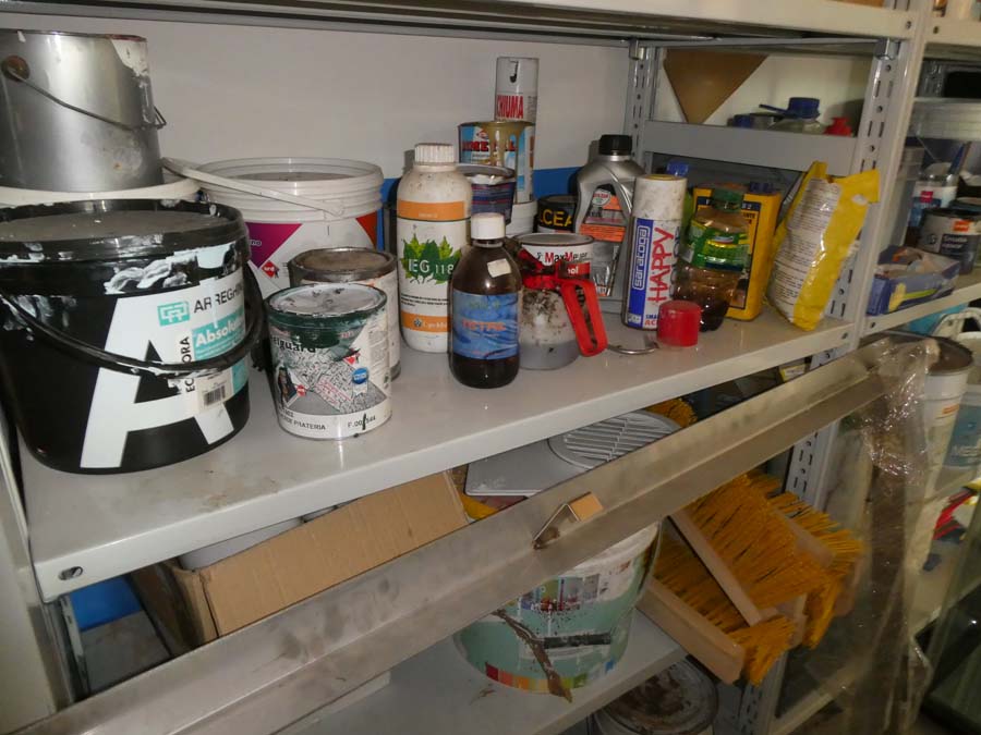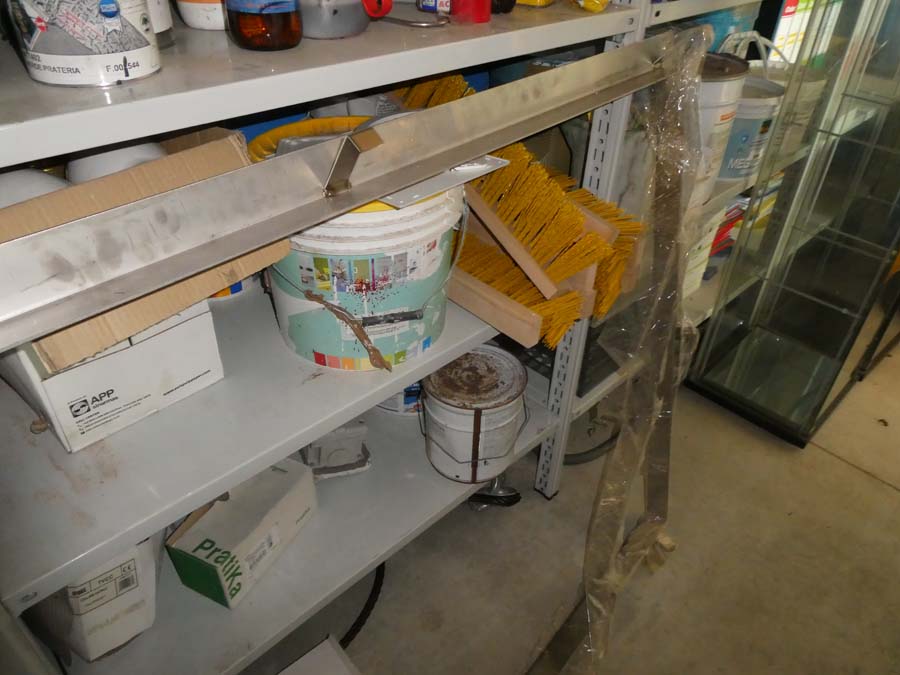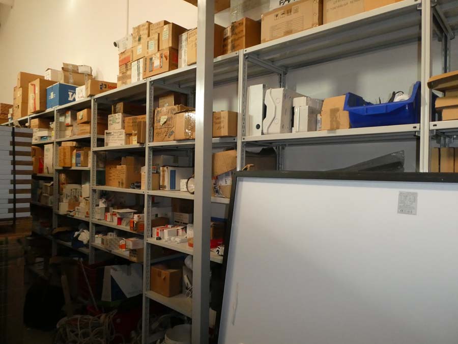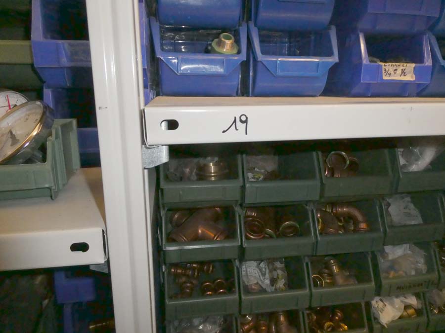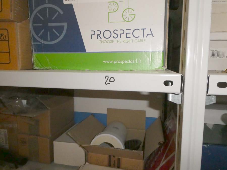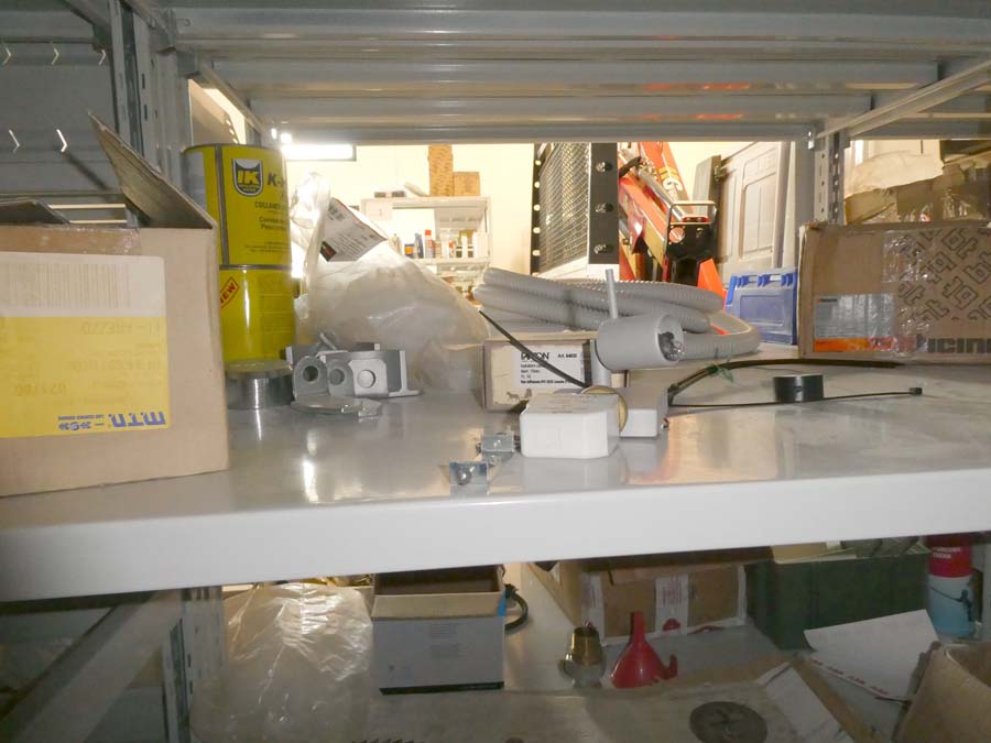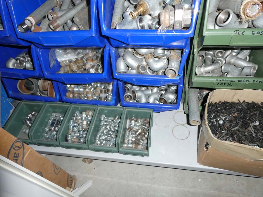 Rif. 1+2+11+15+19+20+28+46 : Scaffalatura contenente prodotti lubrificanti ed altro, usati; Banco in ferro; Doppia scaffalatura espositiva contenente accessori vari; Scaffalatura ad “L” contenente prodotti usati, cavi, staffe, barre, cinghie ed interruttori; Scaffalatura di una lunghezza di circa 10 metri lineari, contenente raccordi, cerniere, flessibili, curve in rame, galleggianti, modulari e apparecchiature elettriche, il tutto in quantità modeste; Scaffalatura di una lunghezza di circa 9 metri lineari contenenti modulari, accessori per impianti di allarme, interruttori, spine, prese, lampade, accessori vari di recupero, solventi vari da smaltire; Scaffalatura 6 metri lineari, contenente lampade, refrigeratori gas e altri vari oggetti; Scaffalatura di circa 6 metri lineari contenente, split, aspiratore, pressa cavi, scatole, centralina, bulloneria assortita, materiale vario in disuso, viti ed altro.