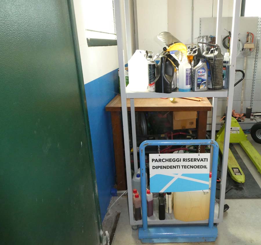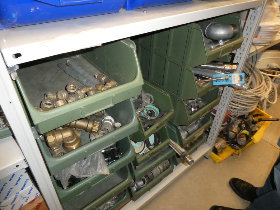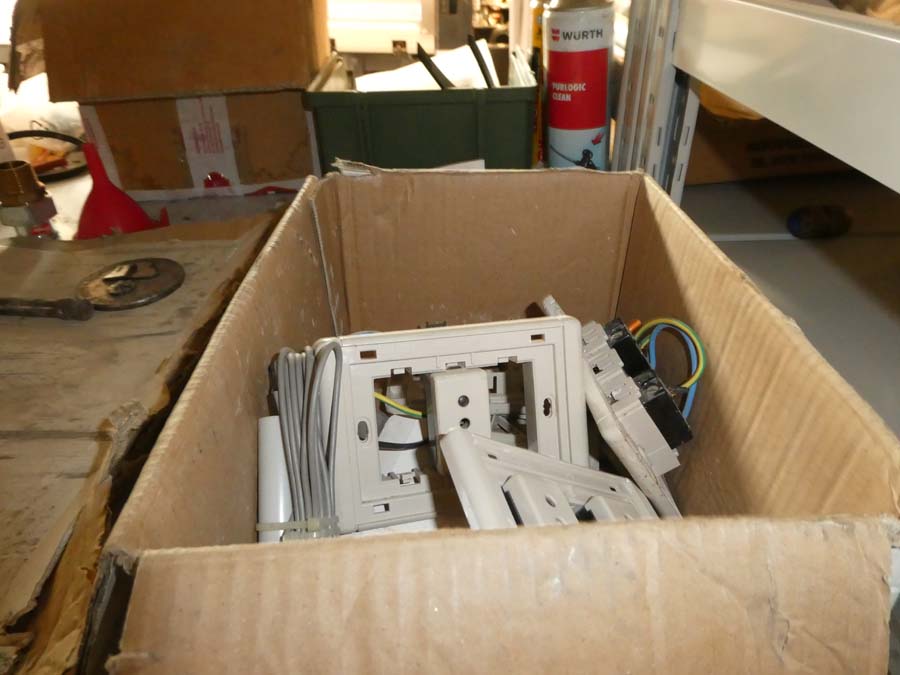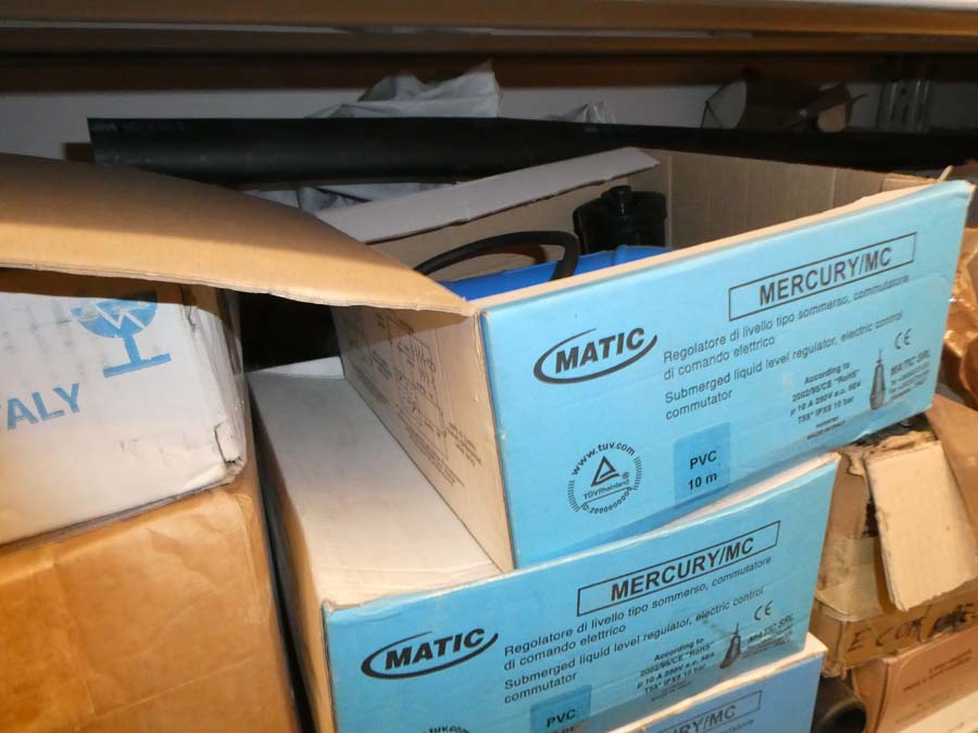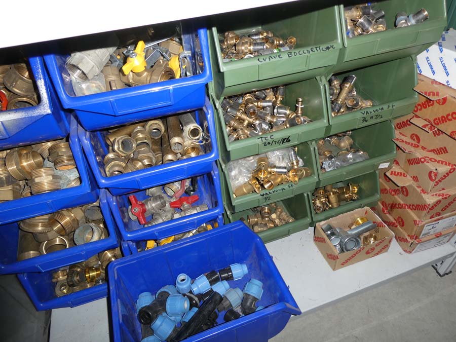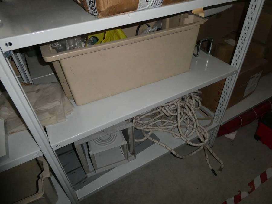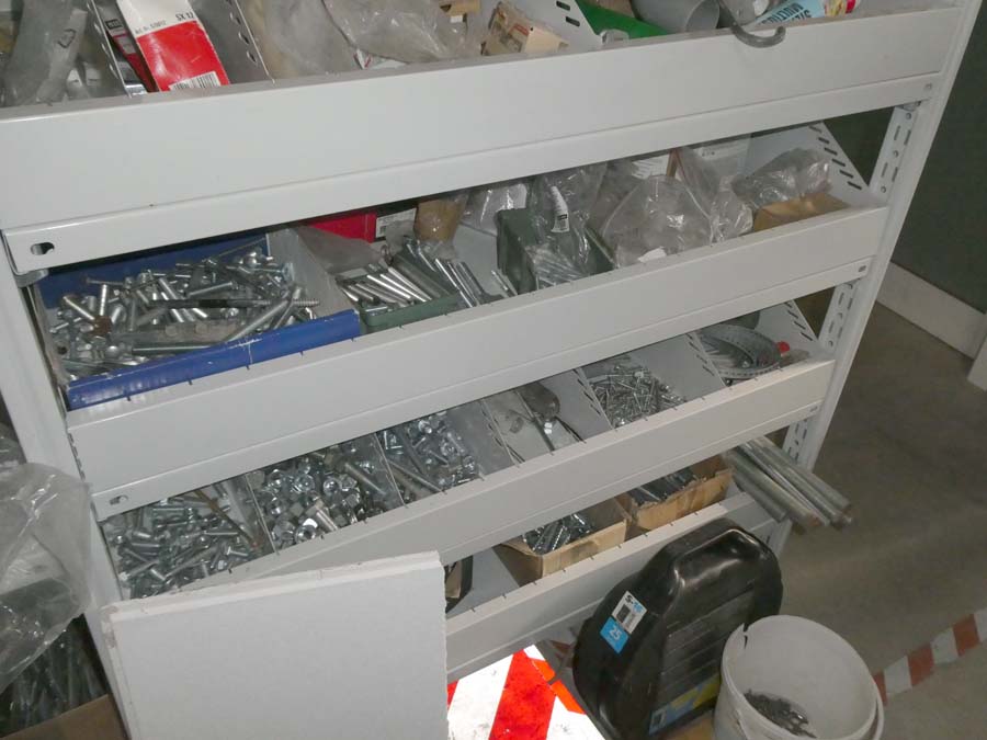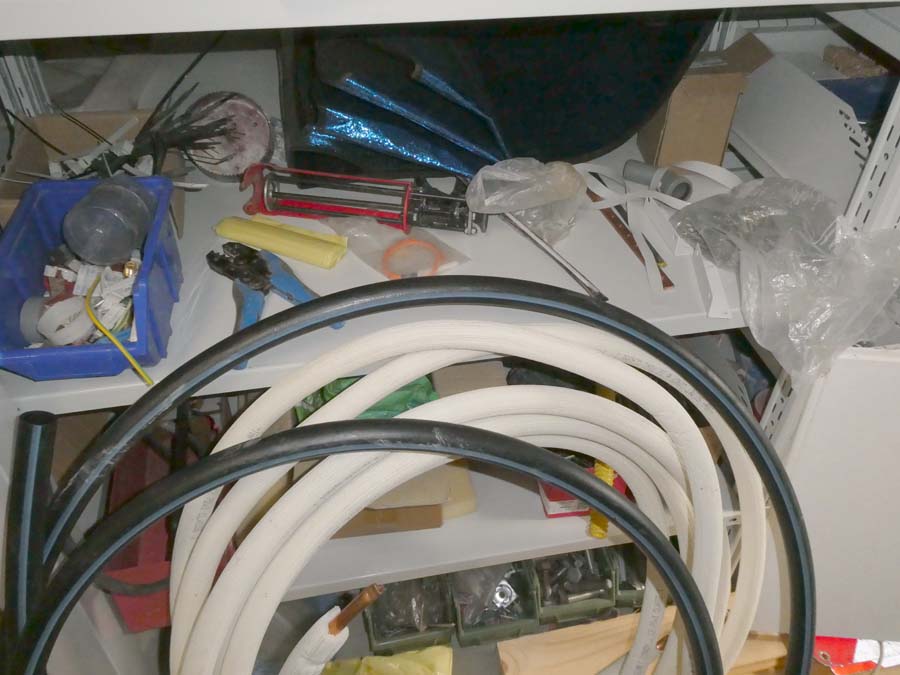 Rif. 1+2+11+15+19+20+28+46 : Scaffalatura contenente prodotti lubrificanti ed altro, usati; Banco in ferro; Doppia scaffalatura espositiva contenente accessori vari; Scaffalatura ad “L” contenente prodotti usati, cavi, staffe, barre, cinghie ed interruttori; Scaffalatura di una lunghezza di circa 10 metri lineari, contenente raccordi, cerniere, flessibili, curve in rame, galleggianti, modulari e apparecchiature elettriche, il tutto in quantità modeste; Scaffalatura di una lunghezza di circa 9 metri lineari contenenti modulari, accessori per impianti di allarme, interruttori, spine, prese, lampade, accessori vari di recupero, solventi vari da smaltire; Scaffalatura 6 metri lineari, contenente lampade, refrigeratori gas e altri vari oggetti; Scaffalatura di circa 6 metri lineari contenente, split, aspiratore, pressa cavi, scatole, centralina, bulloneria assortita, materiale vario in disuso, viti ed altro.