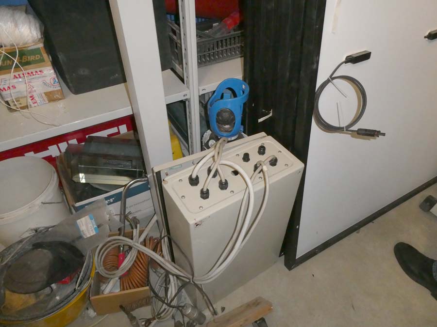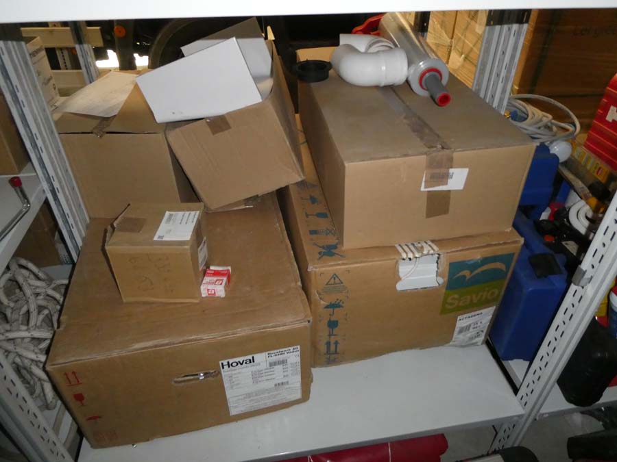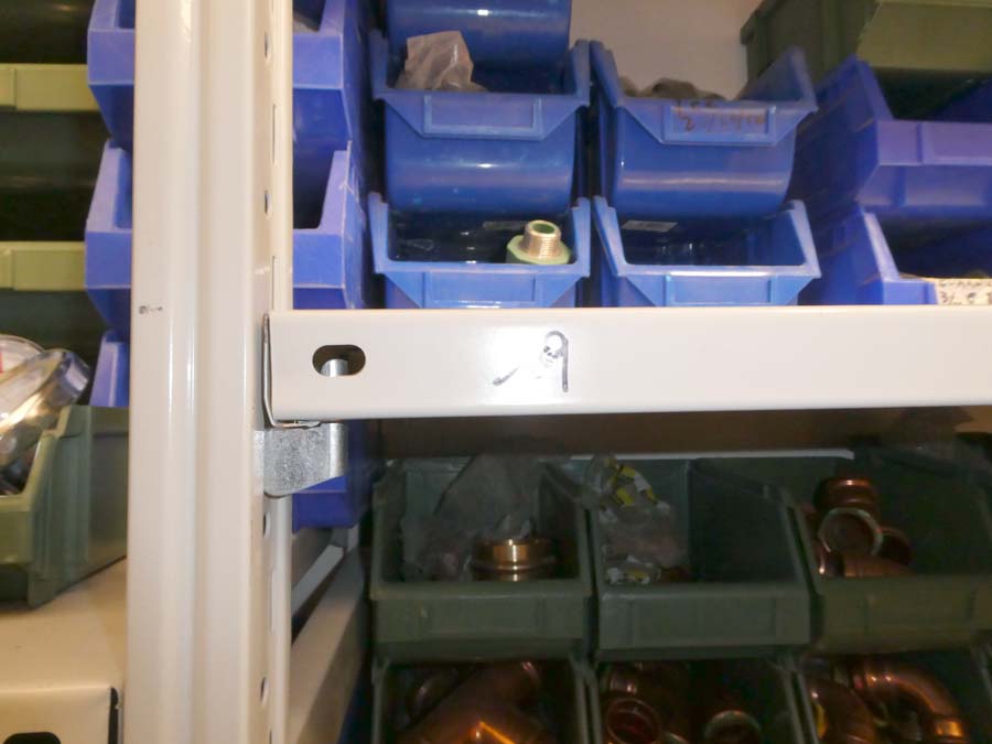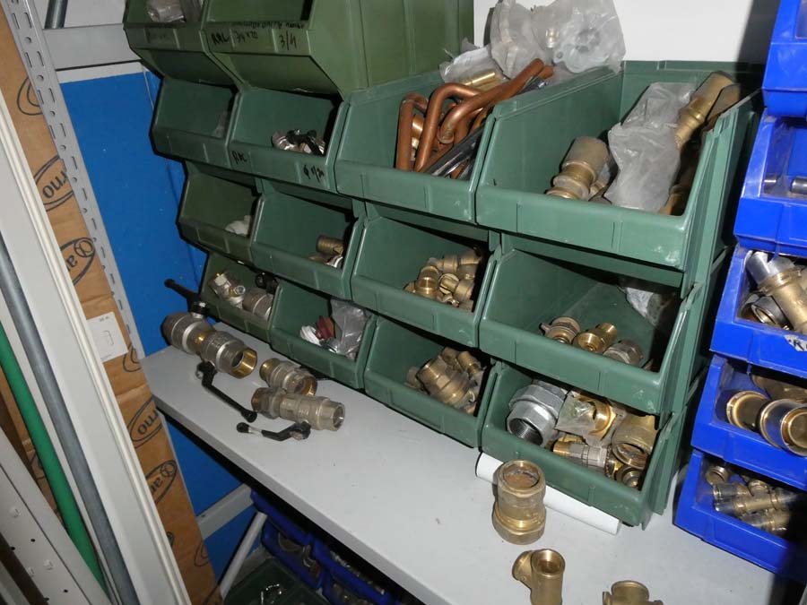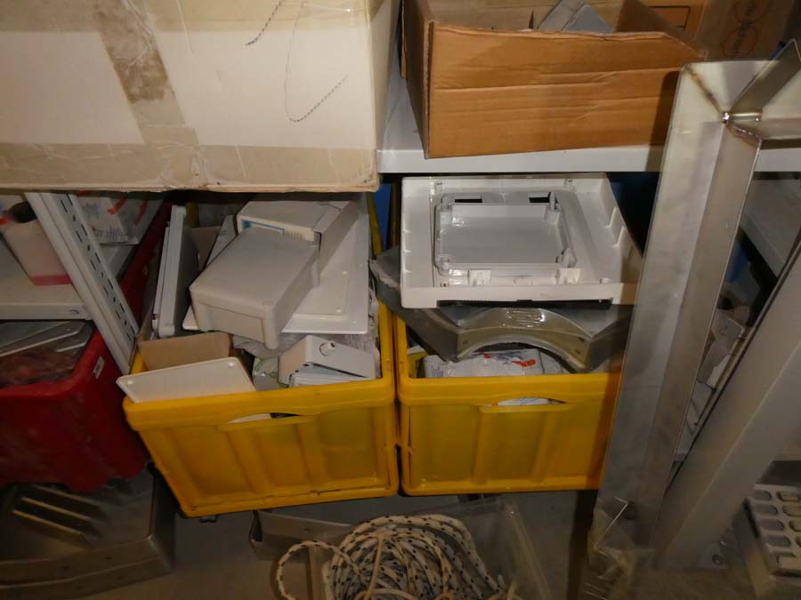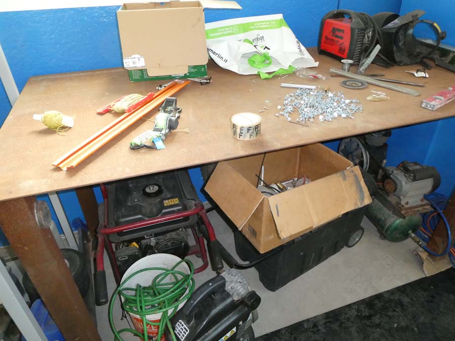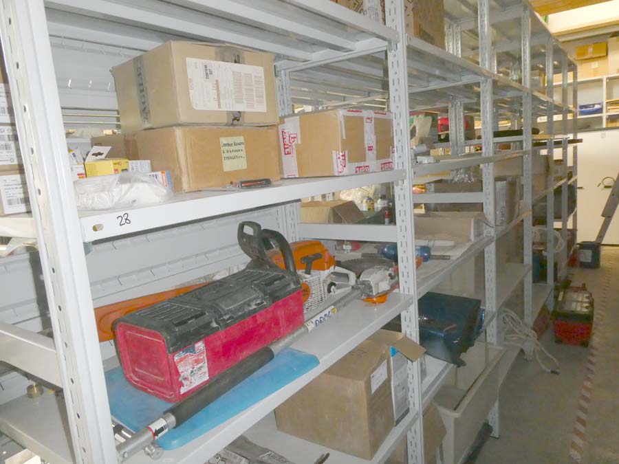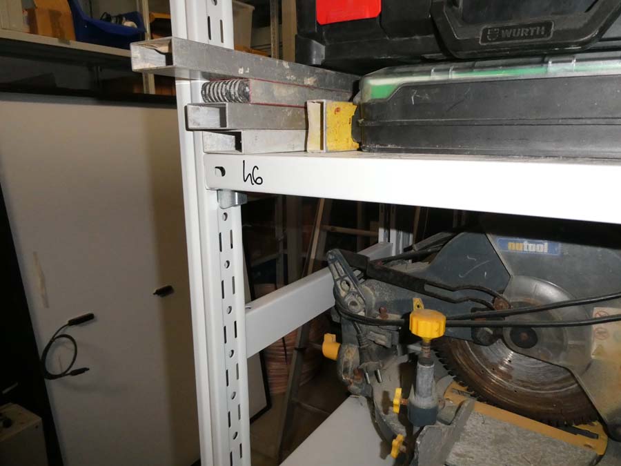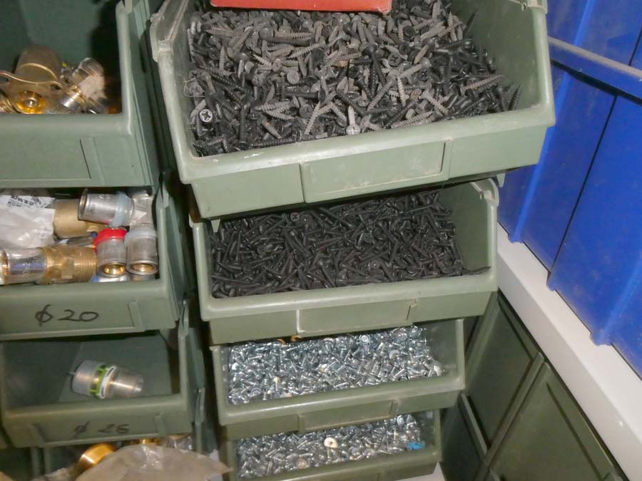 Rif. 1+2+11+15+19+20+28+46 : Scaffalatura contenente prodotti lubrificanti ed altro, usati; Banco in ferro; Doppia scaffalatura espositiva contenente accessori vari; Scaffalatura ad “L” contenente prodotti usati, cavi, staffe, barre, cinghie ed interruttori; Scaffalatura di una lunghezza di circa 10 metri lineari, contenente raccordi, cerniere, flessibili, curve in rame, galleggianti, modulari e apparecchiature elettriche, il tutto in quantità modeste; Scaffalatura di una lunghezza di circa 9 metri lineari contenenti modulari, accessori per impianti di allarme, interruttori, spine, prese, lampade, accessori vari di recupero, solventi vari da smaltire; Scaffalatura 6 metri lineari, contenente lampade, refrigeratori gas e altri vari oggetti; Scaffalatura di circa 6 metri lineari contenente, split, aspiratore, pressa cavi, scatole, centralina, bulloneria assortita, materiale vario in disuso, viti ed altro.