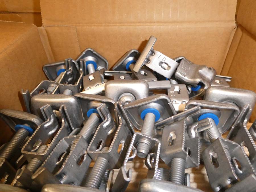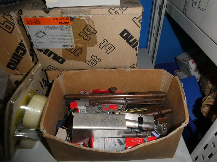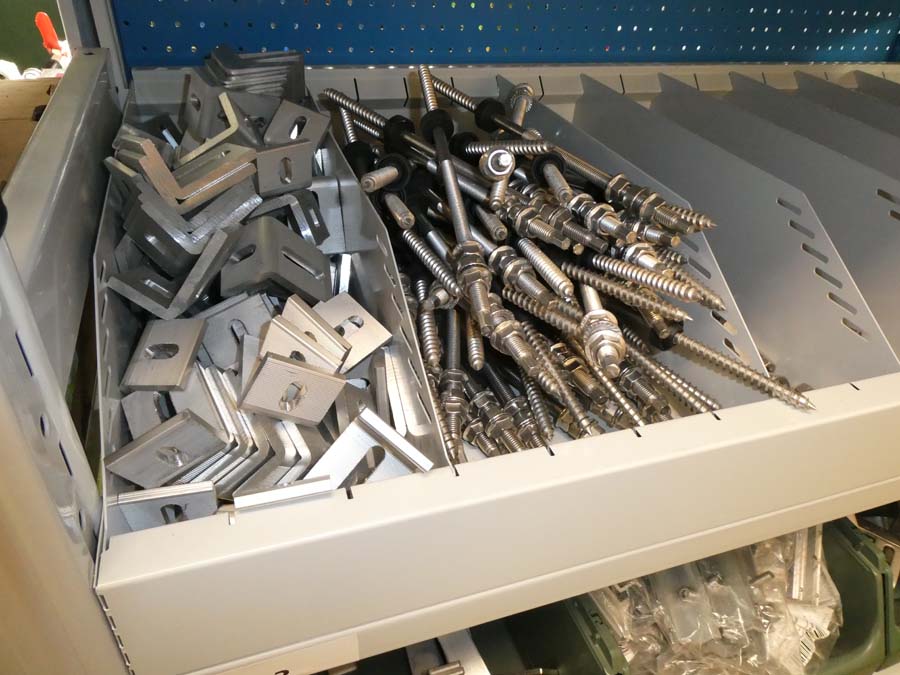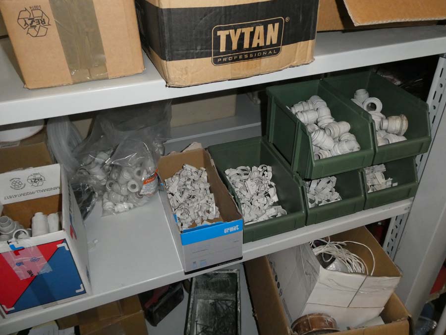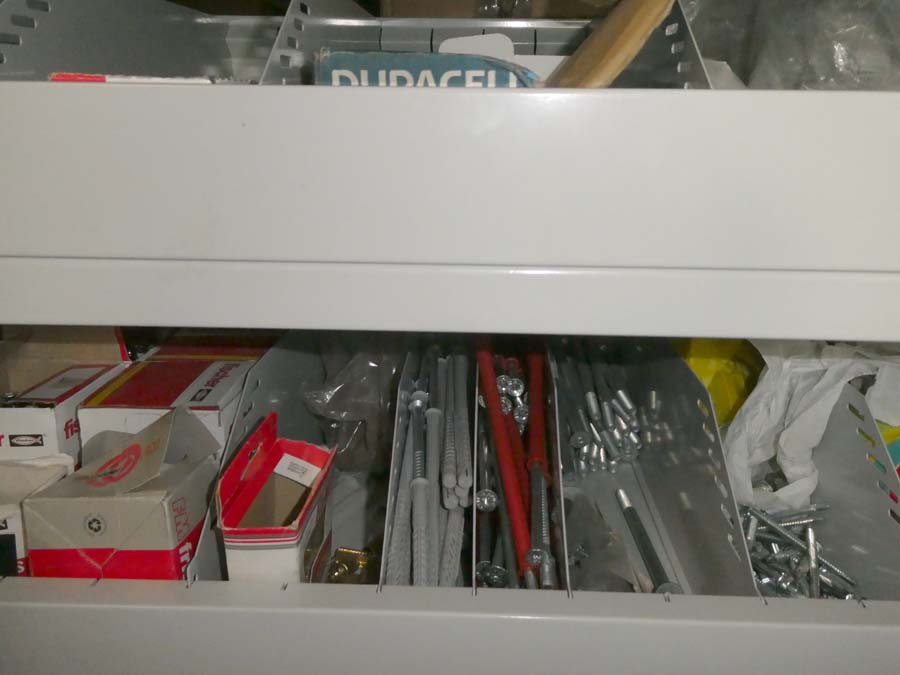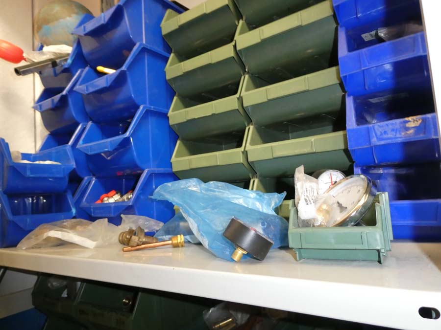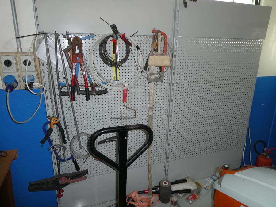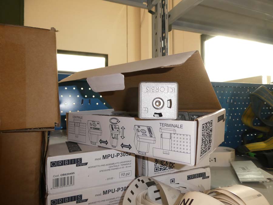 Rif. 1+2+11+15+19+20+28+46 : Scaffalatura contenente prodotti lubrificanti ed altro, usati; Banco in ferro; Doppia scaffalatura espositiva contenente accessori vari; Scaffalatura ad “L” contenente prodotti usati, cavi, staffe, barre, cinghie ed interruttori; Scaffalatura di una lunghezza di circa 10 metri lineari, contenente raccordi, cerniere, flessibili, curve in rame, galleggianti, modulari e apparecchiature elettriche, il tutto in quantità modeste; Scaffalatura di una lunghezza di circa 9 metri lineari contenenti modulari, accessori per impianti di allarme, interruttori, spine, prese, lampade, accessori vari di recupero, solventi vari da smaltire; Scaffalatura 6 metri lineari, contenente lampade, refrigeratori gas e altri vari oggetti; Scaffalatura di circa 6 metri lineari contenente, split, aspiratore, pressa cavi, scatole, centralina, bulloneria assortita, materiale vario in disuso, viti ed altro.
