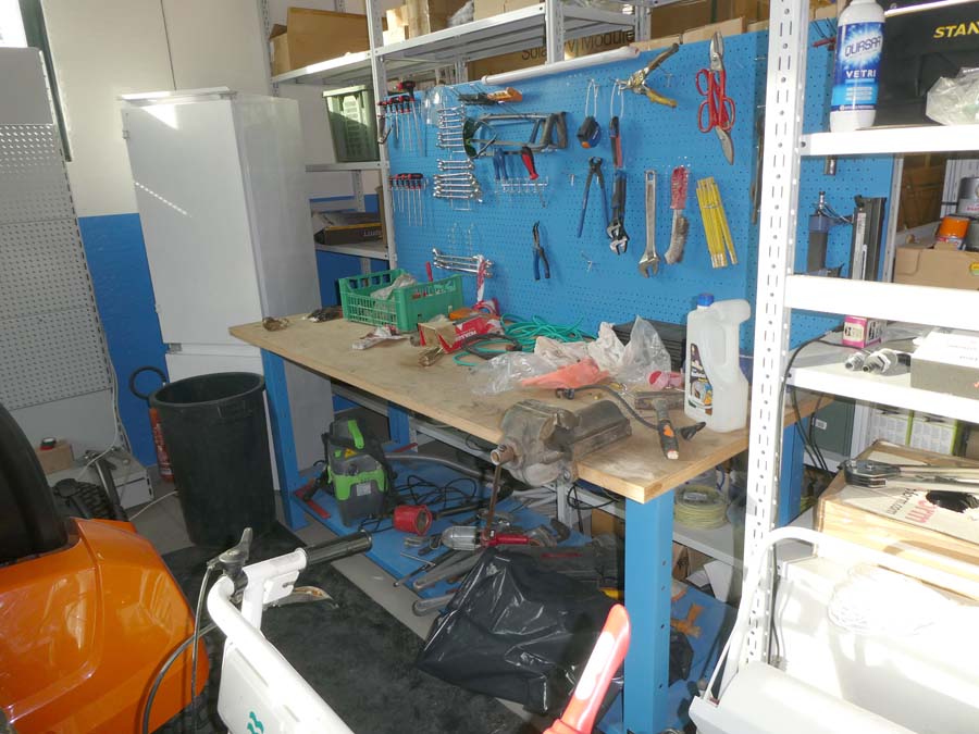 Rif. 8+12+13+22+23 : Traspallet di colore verde; Frigo a due ante provvisto di congelatore; Banco in metallo e legno provvisto di morsa e rastrelliera con utensili vari; Scala in alluminio; Carrello in acciaio.