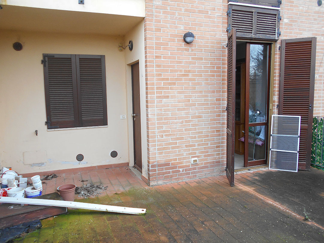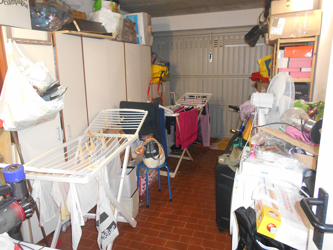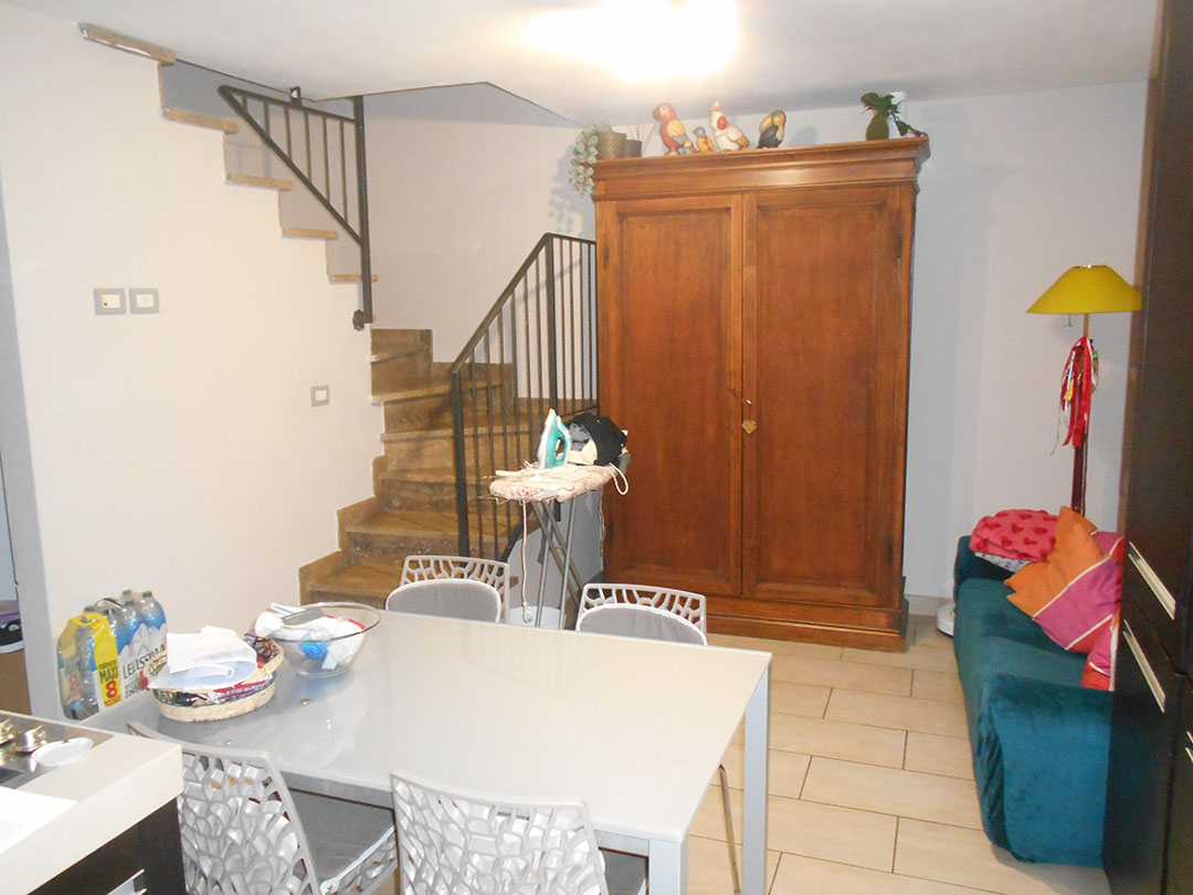 Appartamento composto al piano terra da lastricato, ingresso, soggiorno, due camere da letto (una delle quali con balcone) e ripostiglio; al piano seminterrato da cucina, sala da pranzo, bagno, sottoscala e resede. A corredo autorimessa.