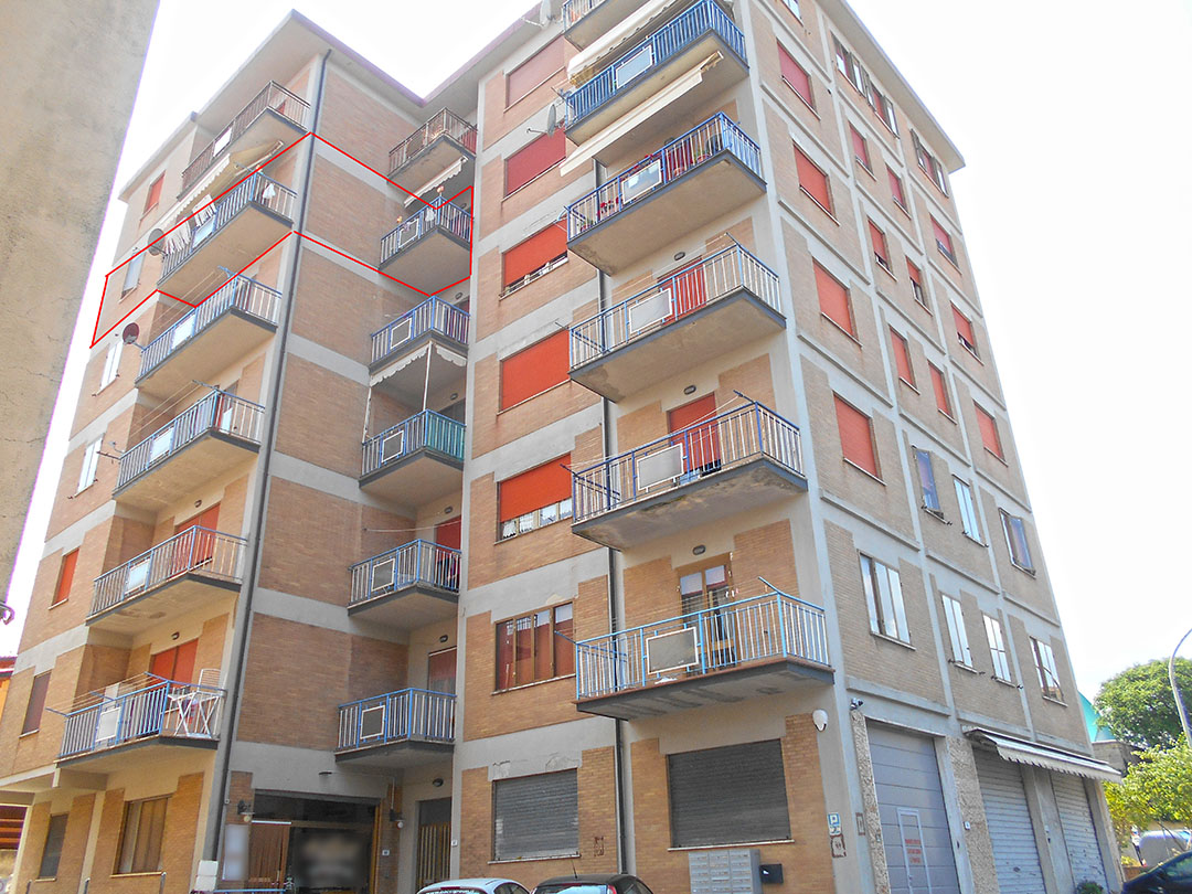 Appartamento di mq 119 al quinto piano formato da ingresso, cucina, soggiorno/pranzo, ripostiglio, disimpegno, tre camere, bagno, due terrazzi e soffitta a settimo piano.