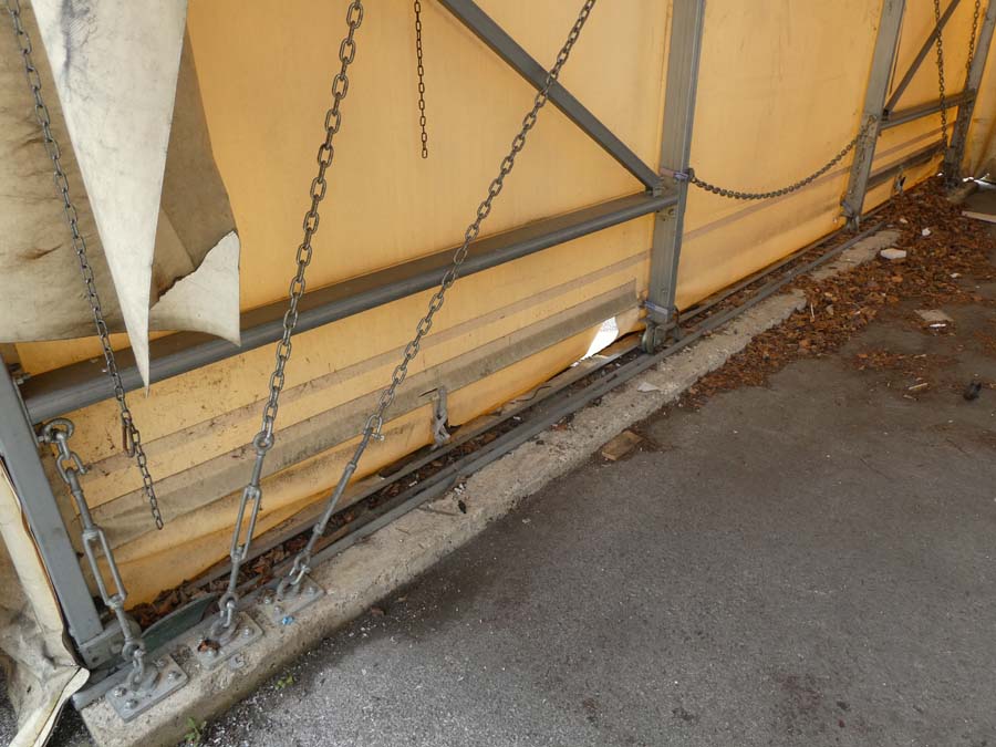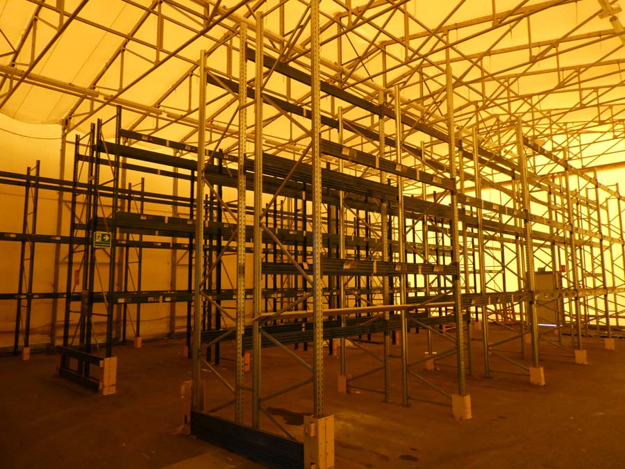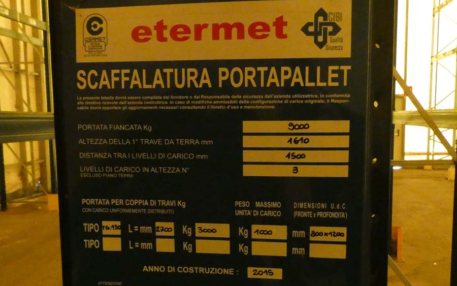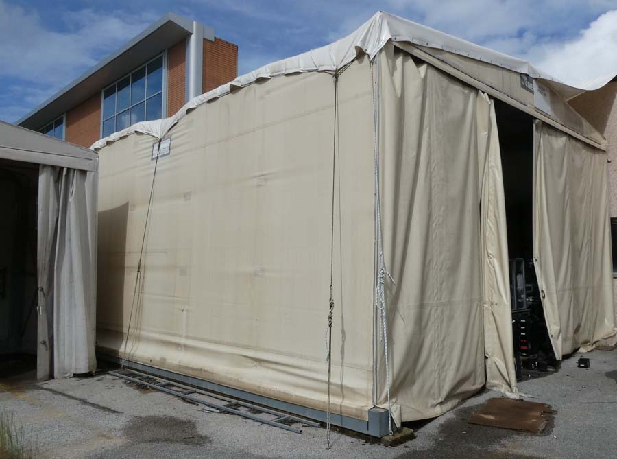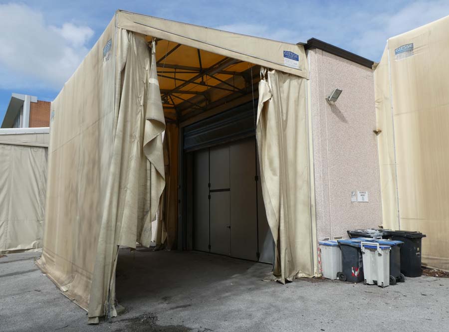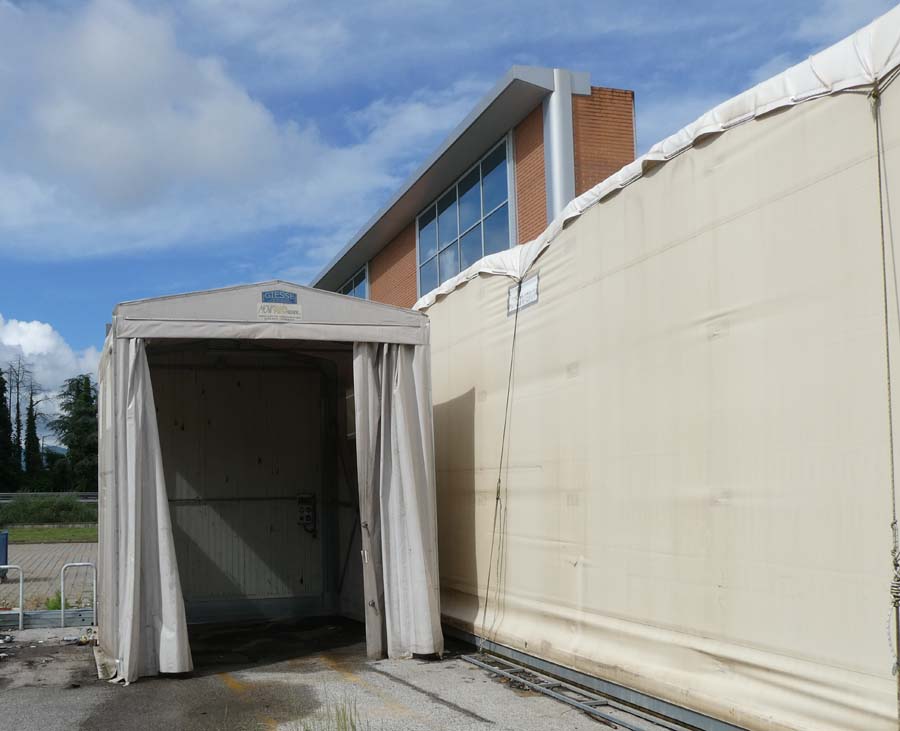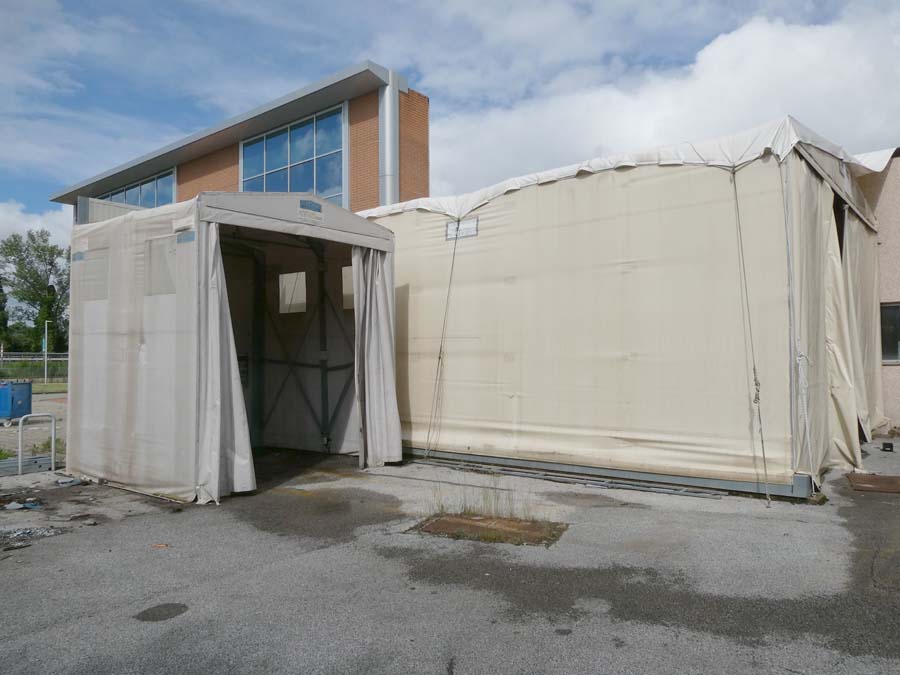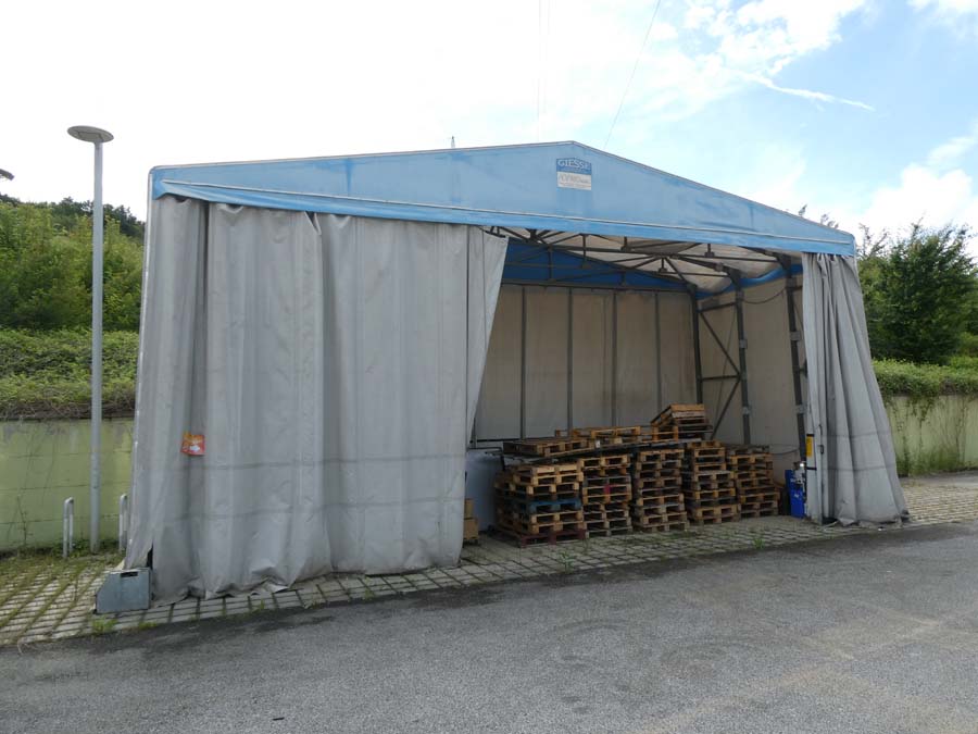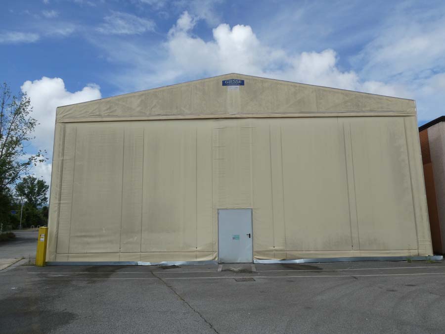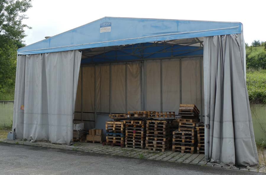 Lotto 1-14 - Tensostruttura marca Giesse misura Mt. 4x10; Tensostruttura appoggiata, marca Giesse misura Mt. 15x20, all’interno della stessa staziona una imponente scaffalatura composta da circa 39 campate di circa 2,70 cadauna con le relative spalle iniziali pari a 46 pezzi; Tensostruttura marca J Civert misura Mt. 7x10; Tensostruttura marca Giesse Mt. 3x3; Tensostruttura appoggiata per carico/scarico Mt. 6x5; Scaffalatura soppalcata Mt. 9x4 con due scomparti accoppiati, struttura removibile; Fasatore Rego Ducati Energia – reactive power controller; Gruppo di continuità Riello Multisentry; Motore di aspirazione e canalizzazione esterno; Scrivania con piano in vetro rosso; N. 2 Compressori Atlas Copco; N. 2 Serbatoi; Ventilatore MTA Energy; Essiccatore Dry Extreme MTA 7.