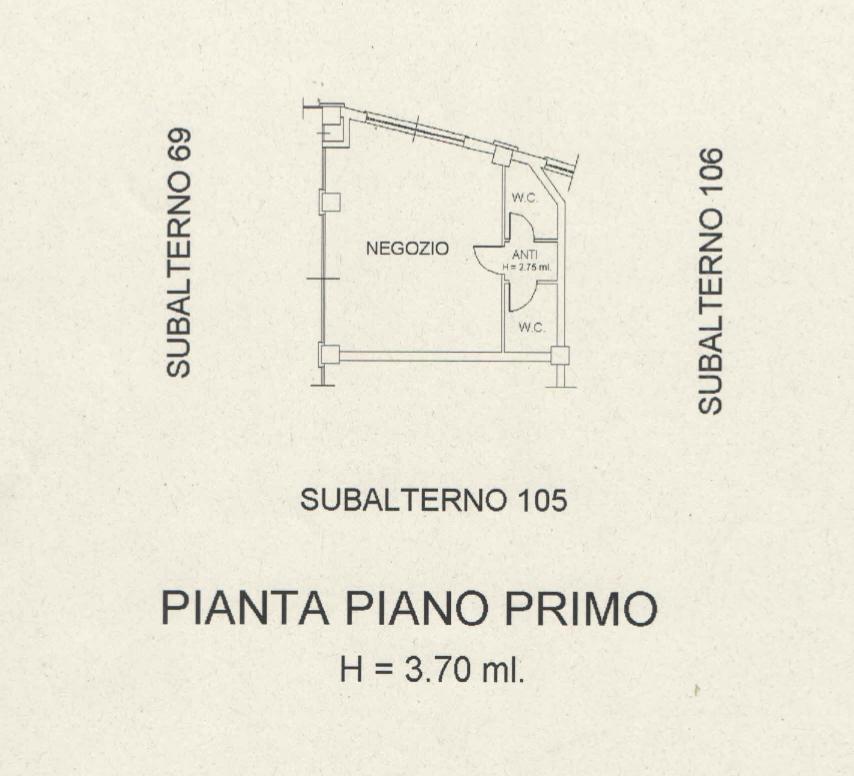 Locale commerciale al primo piano composto da un vano destinato a negozio con antibagno e due servizi igienici. Superficie commerciale: mq. 55 circa.
