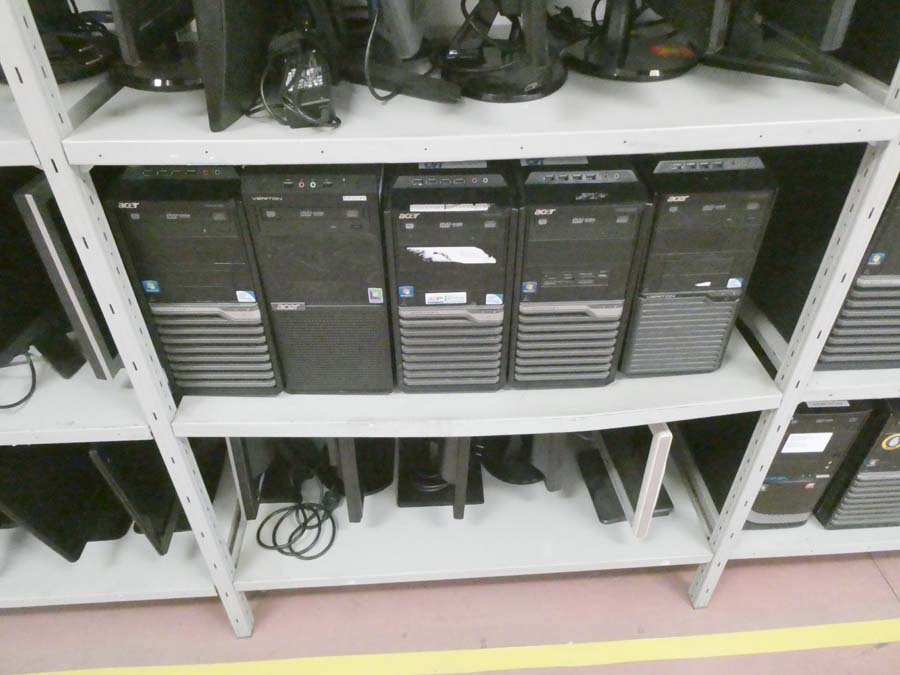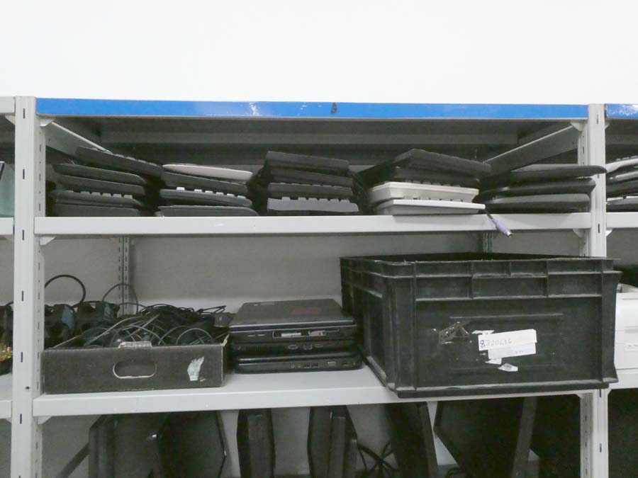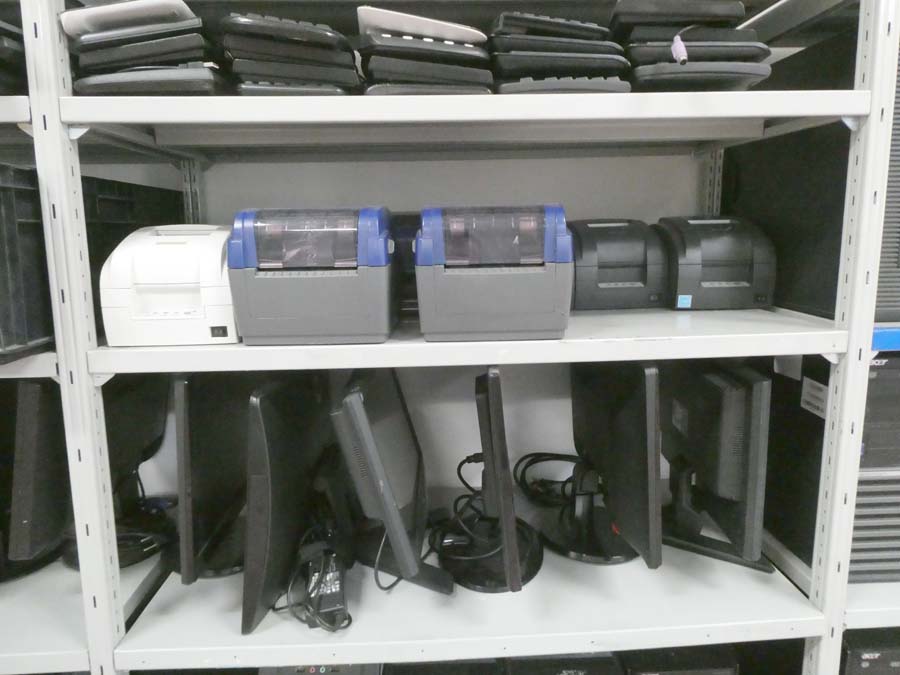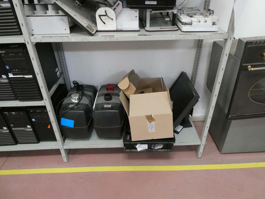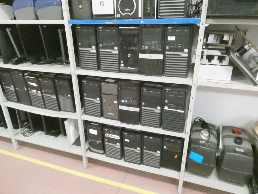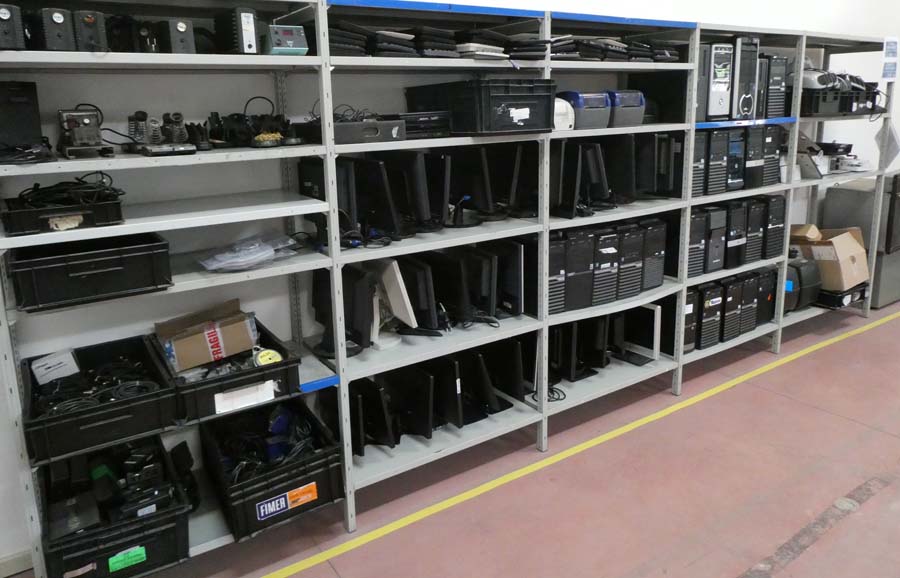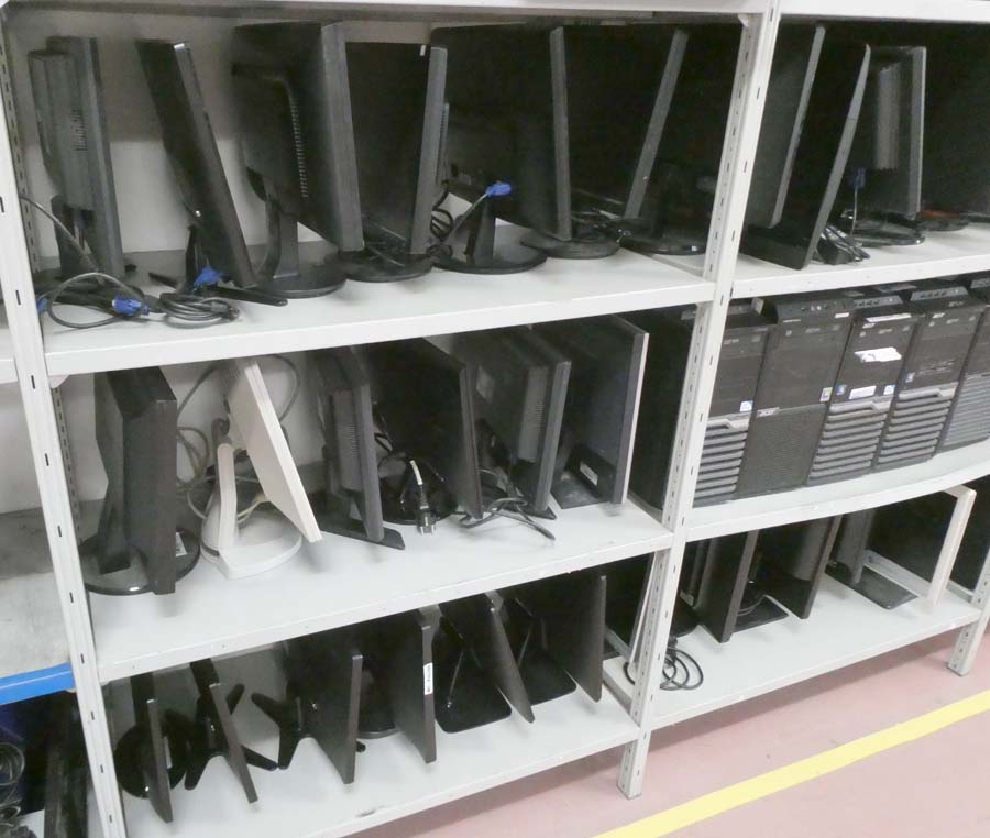 Lotto n. LOTTO E - Scaffalatura contenente N. 25 case, circa 40 tastiere, 30 schermi, n. 9 stampanti, stazioni di saldatura varie, cavi, avvolgitori, aspiratore, stufe, telefoni, portatili, n. 7 portatili e altro.