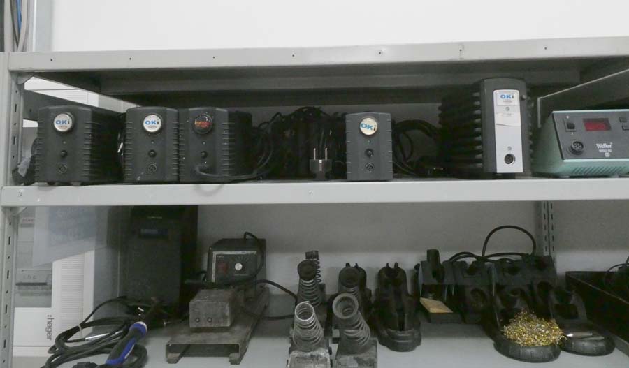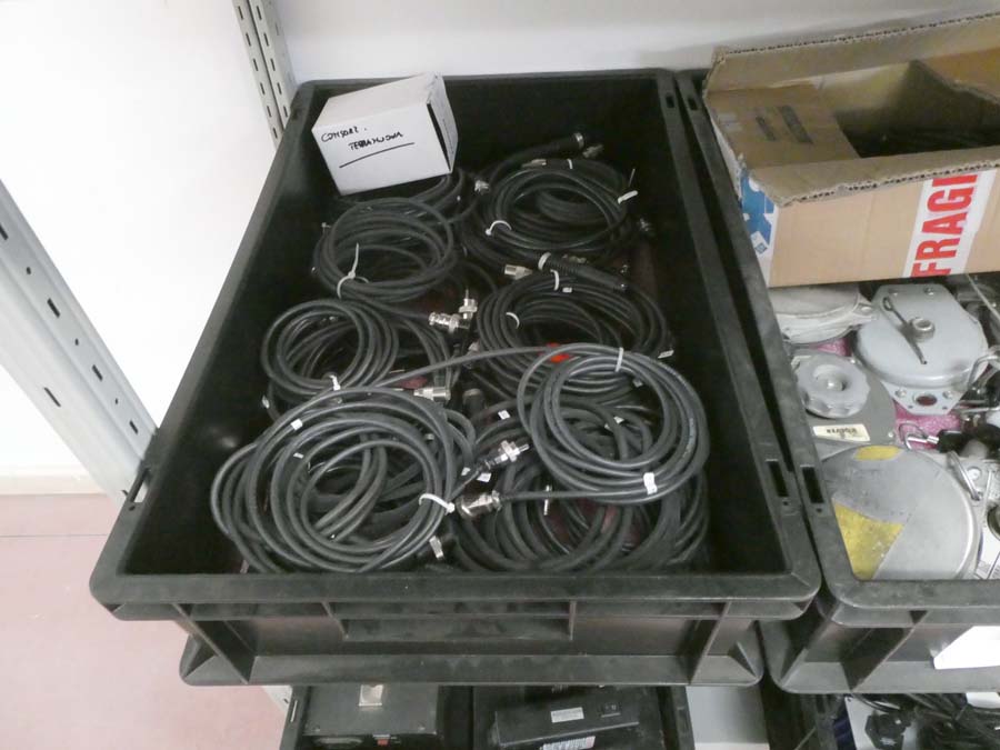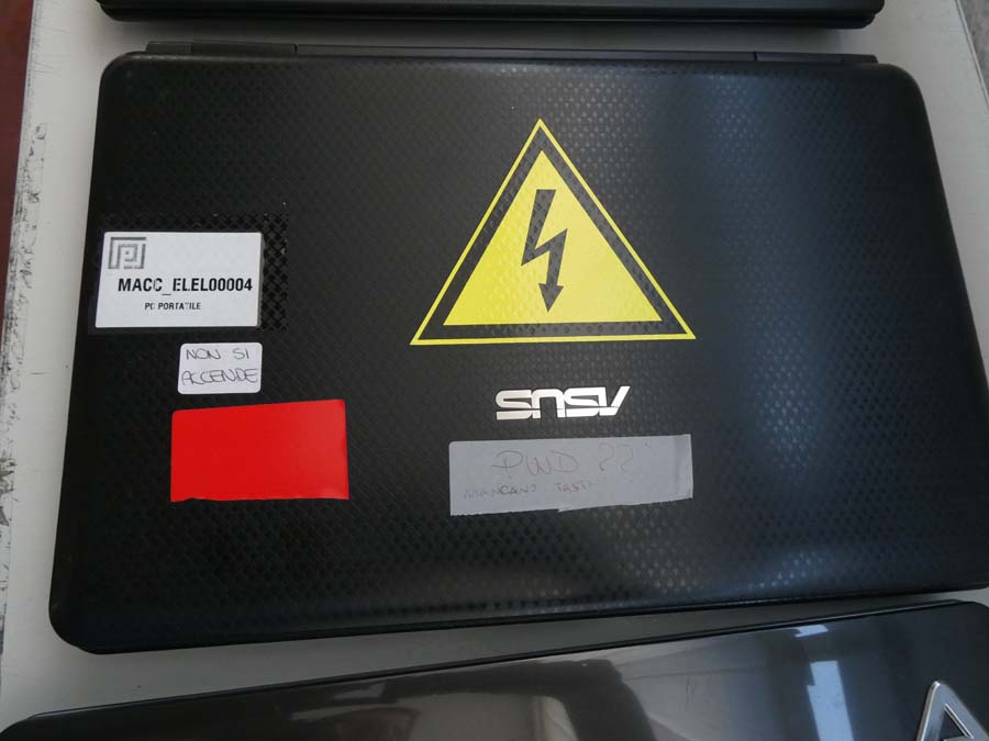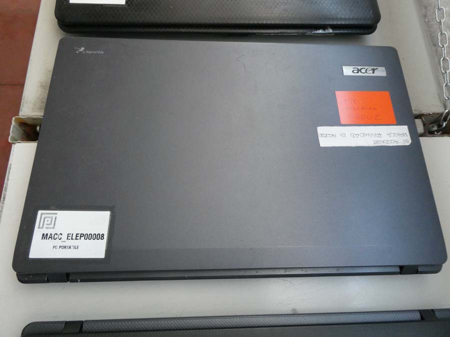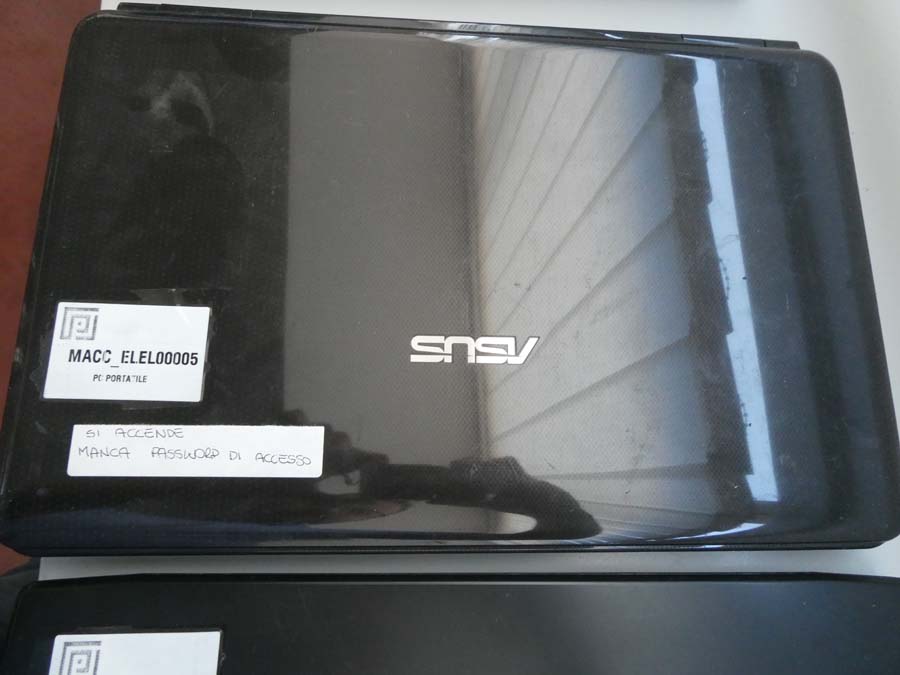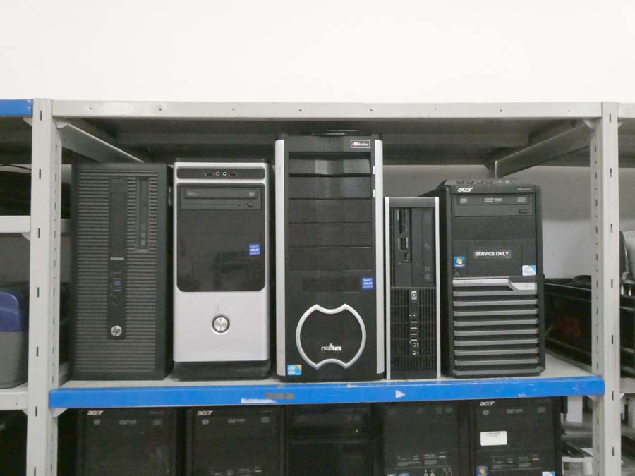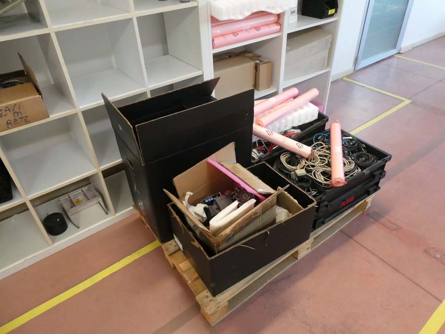 Lotto n. LOTTO E - Scaffalatura contenente N. 25 case, circa 40 tastiere, 30 schermi, n. 9 stampanti, stazioni di saldatura varie, cavi, avvolgitori, aspiratore, stufe, telefoni, portatili, n. 7 portatili e altro.