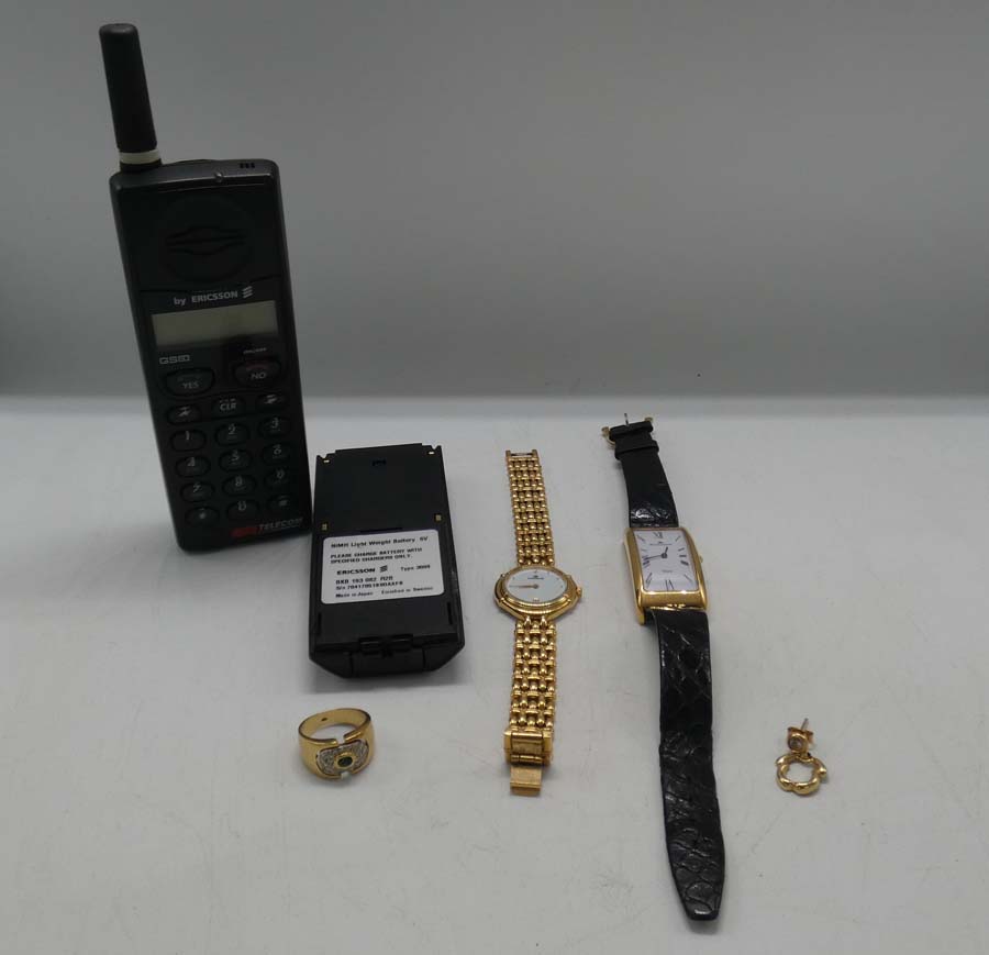 Lotto 84/2A) Orologio Lorenz, orologio Maurice Lacroix, anello oro pietra centrale colore verde e brillanti fondo chiaro gr. 6,7, orecchino a forma di pendente con pietra al centro gr. 1,4, Telefono Ericson con due batterie.