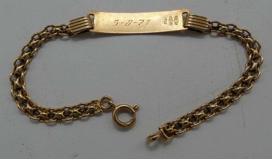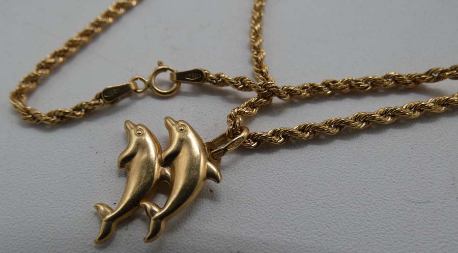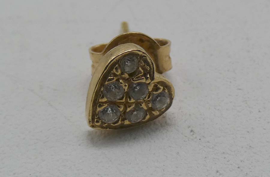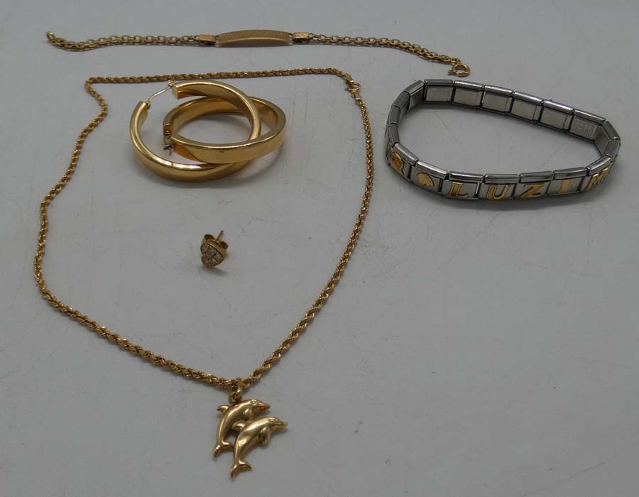 Lotto 92 B) orecchino in oro forma di cuore con pietre , due orecchini in oro rotondi gr. 9, braccialetto in oro con nome gr. 8,8, catenina in oro con due delfini gr. 3, braccialetto con lettere rilievo e disegni.