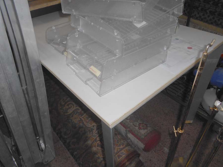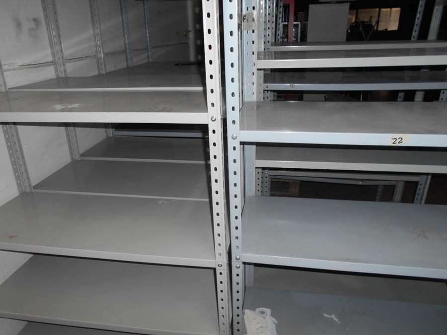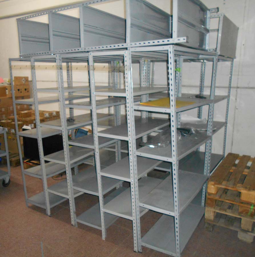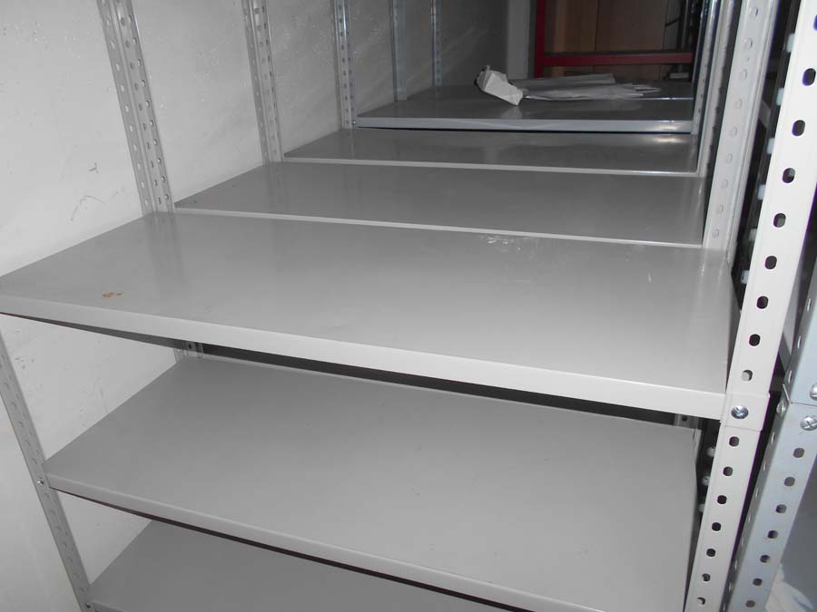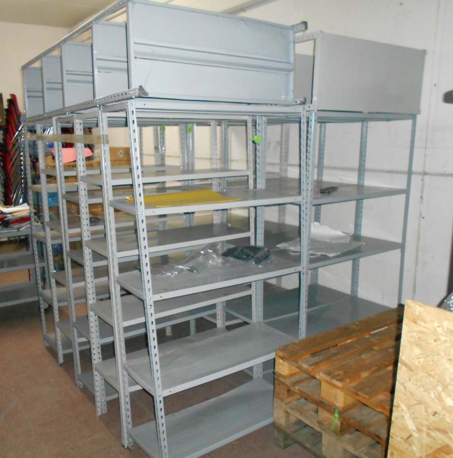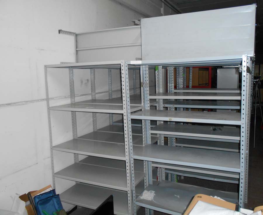 LOTTO 11, 13) N. 12 scaffali a 5 ripiani colore grigio, scrivania con sedia.