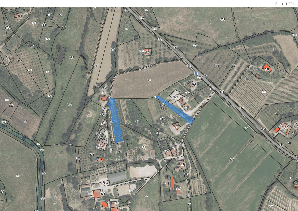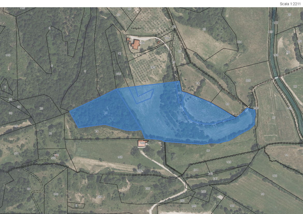 al Foglio 60 particella 23 (qualità bosco misto, classe 3, superficie ha 00.78.90, reddito dominicale € 1,63, reddito agrario € 1,22), particella 26 (qualità seminativo, classe 2, superficie ha 01.93.40, reddito dominicale € 104,88, reddito agrario € 69,92), particella 88 (qualità vigneto, classe 2, superficie ha 00.42.50, reddito dominicale € 15,36, reddito agrario € 12,07), particella 103 (qualità uliveto, classe 2, superficie ha 00.08.60, reddito dominicale € 2,00, reddito agrario € 2,22), particella 104 (qualità seminativo, classe 2, superficie ha 00.04.80, reddito dominicale e 2,60, reddito agrario € 1,74) e al Foglio 61 particella 77 (qualità seminativo arborato, classe 3, superficie ha 00.05.60, reddito dominicale € 1,59, reddito agrario € 1,30), particella 142 (qualità uliveto, classe 3, superficie ha 00.12.00, reddito dominicale € 1,86, reddito agrario € 2,48), particella 153 (qualità seminativo arborato, classe 3, superficie ha 00.00.10, reddito dominicale € 0,03, reddito agrario € 0,02), particella 155 (qualità uliveto, classe 2, superficie ha 00.01.50, reddito dominicale € 0,35, reddito agrario € 0,39), particella 181 (qualità uliveto, classe 2, superficie ha 00.00.04, reddito dominicale € 0,01, reddito agrario € 0,01).