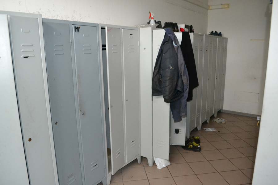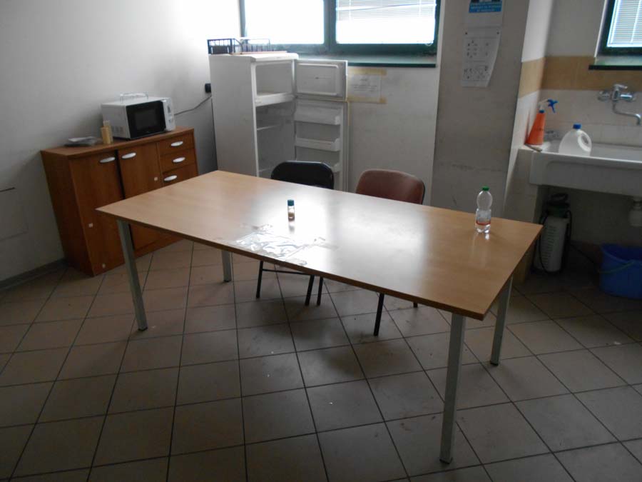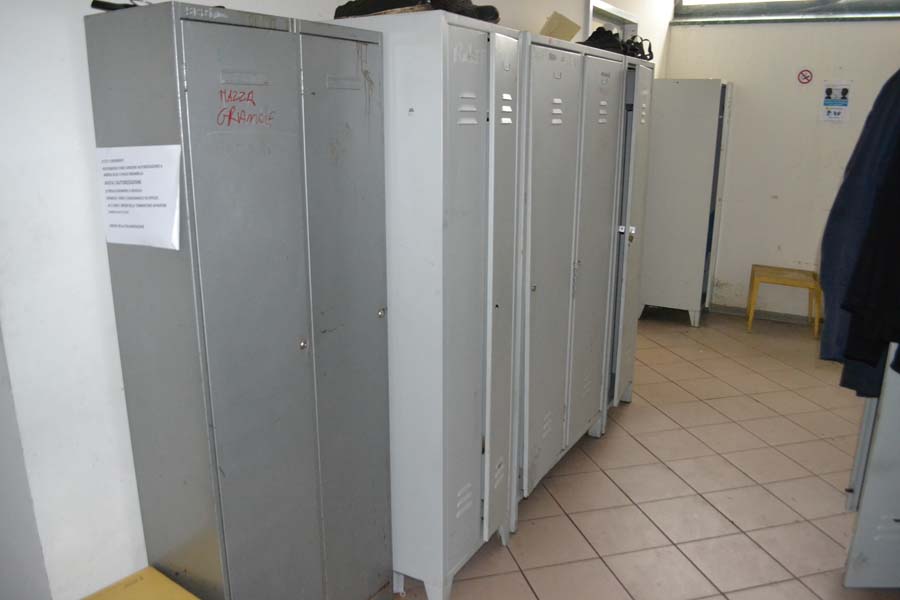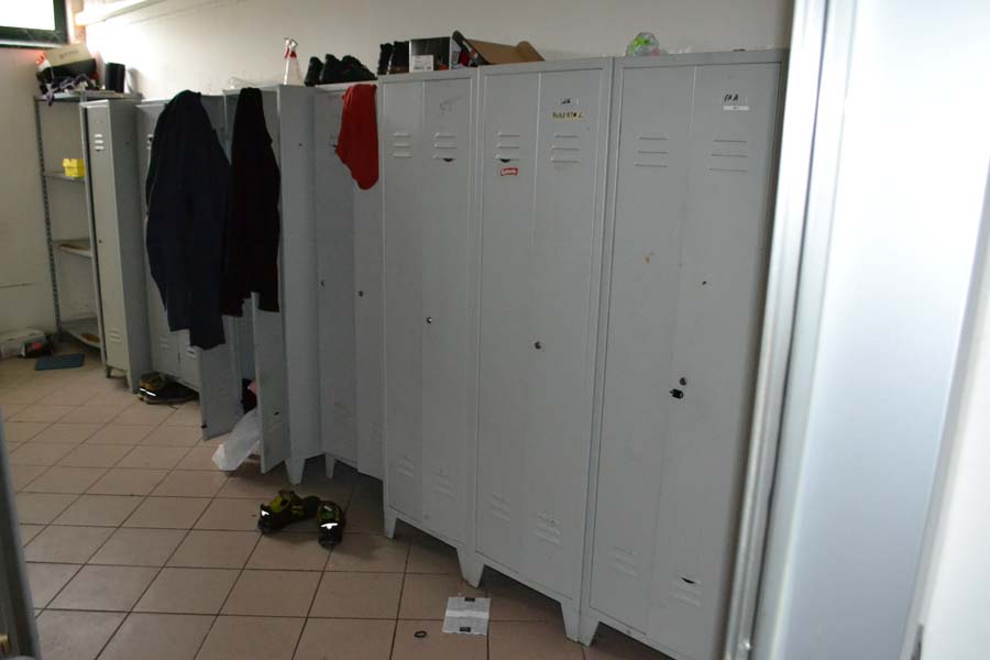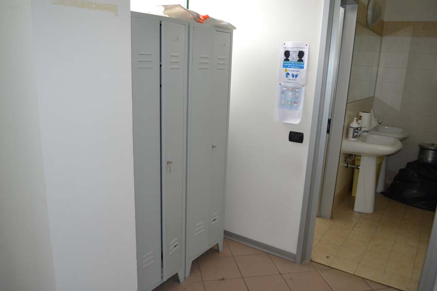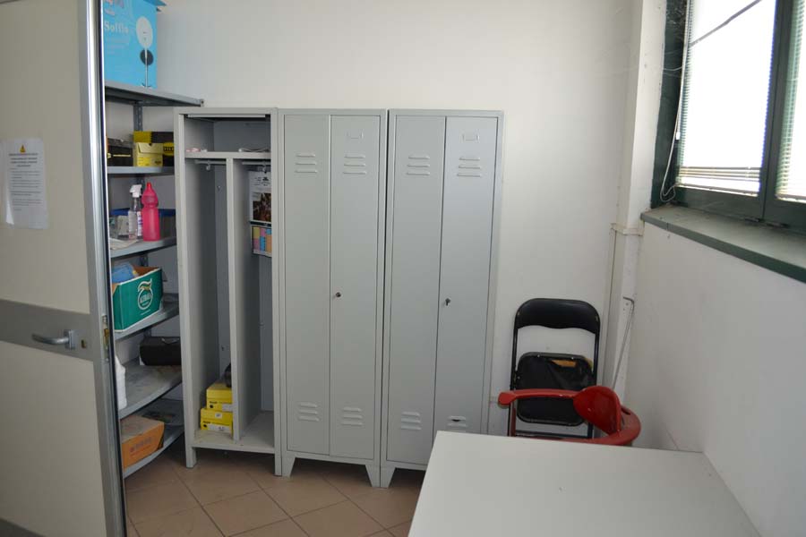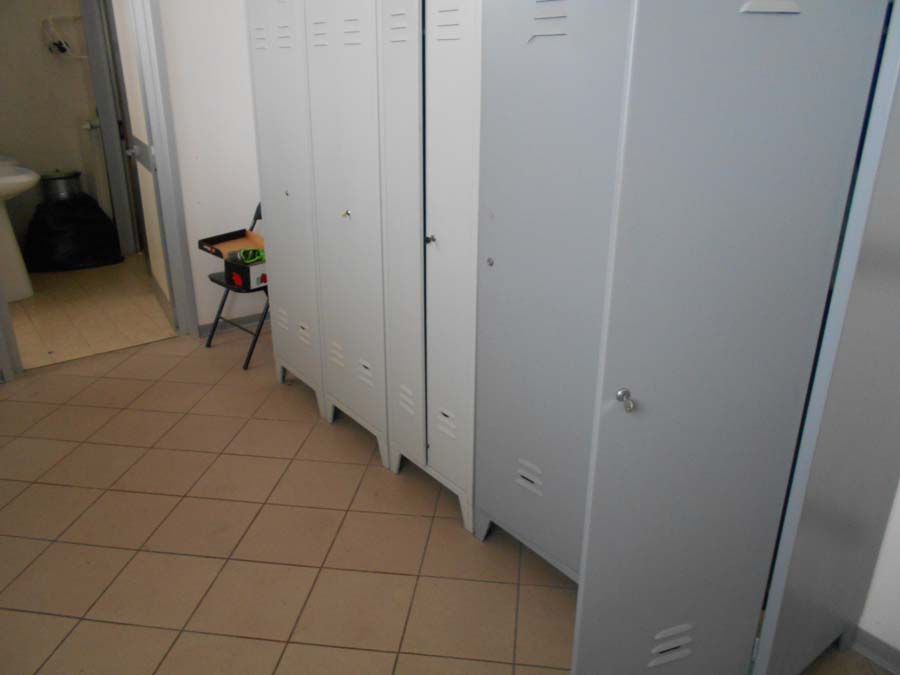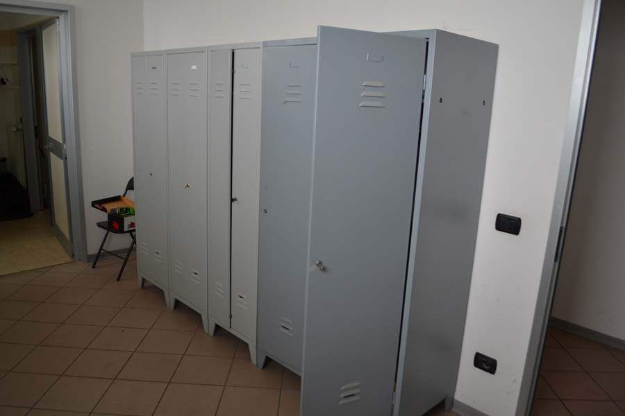 Lotto composto da: N°3 armadietti metallici grigi con ante 50×50×180, spogliatoio divisione sporco/pulito, armadietti per il personale nello spogliatoio donne piano terra; N°1 scaffale in metallo con 6 ripiani 40×190×100; N°3 armadietti metallici grigio chiaro 50×50×180, spogliatoio divisione sporco/pulito, batteria di 3 armadietti singoli; N°1 armadietto metallico grigio scuro a 2 ante 100×50×180, spogliatoio divisione sporco/pulito; N°2 armadietti metallici grigi con ante 50×50×180, spogliatoio divisione sporco/pulito; N°1 armadietto in metallo grigio a 2 ante porta attrezzi pulizia 30×60×180; N°1 armadietto metallico grigio chiaro 50×50×180, spogliatoio divisione sporco/pulito; N°1 scaffale metallico a 4 ripiani 100×40×190; N°10 armadietti metallici grigi 50×50×180, spogliatoio uomini piano terra; N°1 armadietto metallico grigio chiaro 30×70×165, spogliatoio divisione sporco/pulito; N°3 tavoli in metallo e piano legno laminato 90×200 per locale mensa; N°20 sedute in metallo e stoffa/plastica di corredo ai tavoli della mensa; N°1 mobiletto legno con ante e cassetti stoviglie 35×100×90 (mensa); N°1 fornetto microonde nel locale mensa; N°1 tavolo in plastica 100×100 chiaro con una seduta metallo/legno; N°1 pattumiera metallo cilindrica Ø30 cm; N°1 pattumiera plastica verde con coperchio nell’ingresso; N°1 seduta metallo/stoffa nel corridoio ingresso piano terra N°2 armadi metallici di colore grigio con ante scorrevoli a tre ripiani interni 45*180*H200.