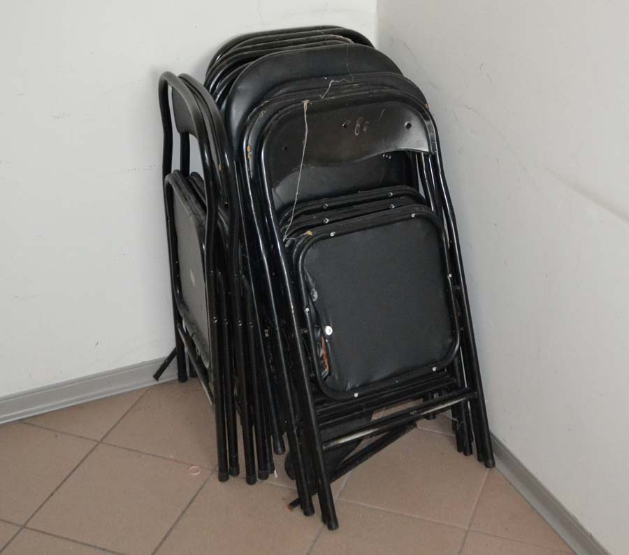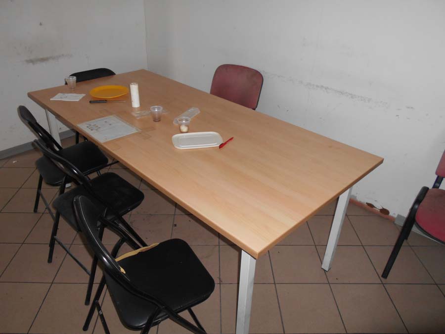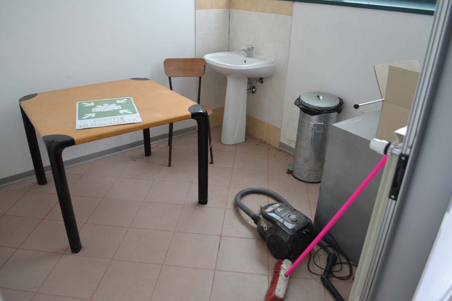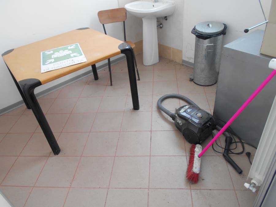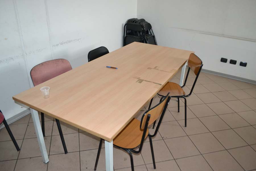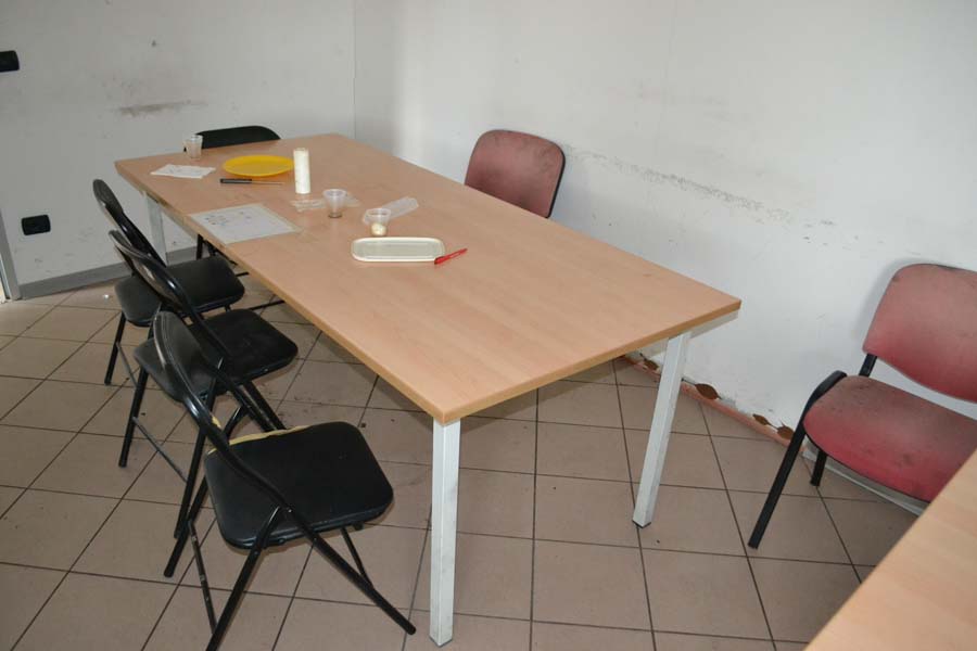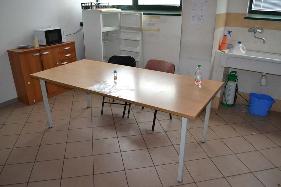 Lotto composto da: N°3 armadietti metallici grigi con ante 50×50×180, spogliatoio divisione sporco/pulito, armadietti per il personale nello spogliatoio donne piano terra; N°1 scaffale in metallo con 6 ripiani 40×190×100; N°3 armadietti metallici grigio chiaro 50×50×180, spogliatoio divisione sporco/pulito, batteria di 3 armadietti singoli; N°1 armadietto metallico grigio scuro a 2 ante 100×50×180, spogliatoio divisione sporco/pulito; N°2 armadietti metallici grigi con ante 50×50×180, spogliatoio divisione sporco/pulito; N°1 armadietto in metallo grigio a 2 ante porta attrezzi pulizia 30×60×180; N°1 armadietto metallico grigio chiaro 50×50×180, spogliatoio divisione sporco/pulito; N°1 scaffale metallico a 4 ripiani 100×40×190; N°10 armadietti metallici grigi 50×50×180, spogliatoio uomini piano terra; N°1 armadietto metallico grigio chiaro 30×70×165, spogliatoio divisione sporco/pulito; N°3 tavoli in metallo e piano legno laminato 90×200 per locale mensa; N°20 sedute in metallo e stoffa/plastica di corredo ai tavoli della mensa; N°1 mobiletto legno con ante e cassetti stoviglie 35×100×90 (mensa); N°1 fornetto microonde nel locale mensa; N°1 tavolo in plastica 100×100 chiaro con una seduta metallo/legno; N°1 pattumiera metallo cilindrica Ø30 cm; N°1 pattumiera plastica verde con coperchio nell’ingresso; N°1 seduta metallo/stoffa nel corridoio ingresso piano terra N°2 armadi metallici di colore grigio con ante scorrevoli a tre ripiani interni 45*180*H200.