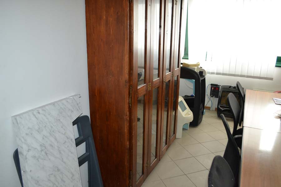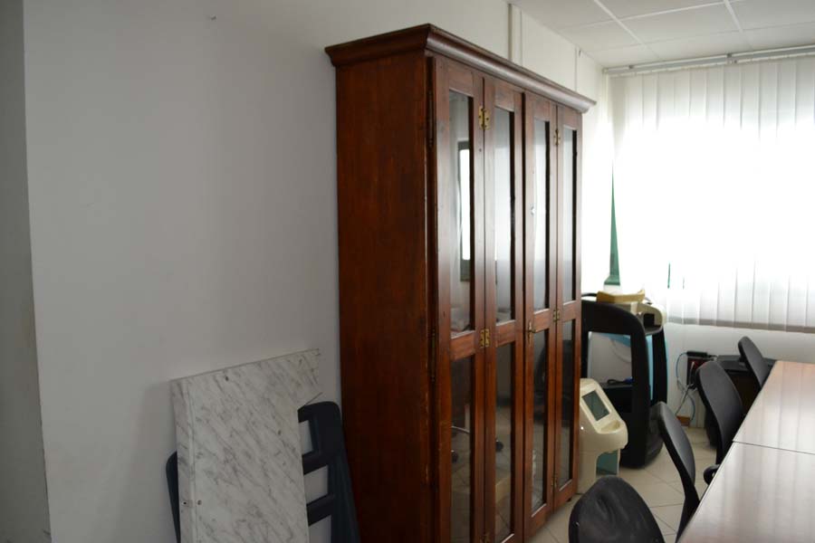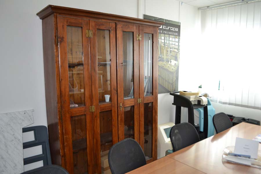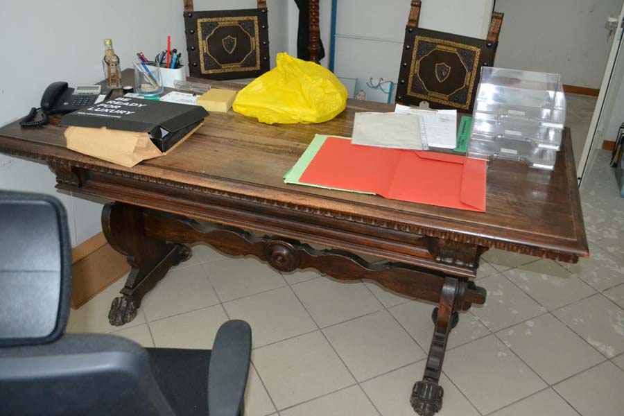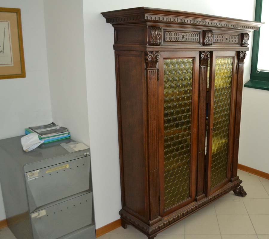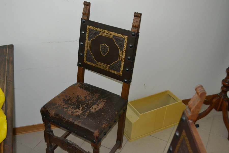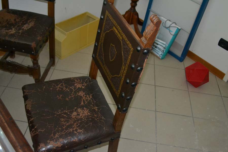 Lotto composto da: mobile antico, in legno, con ante il legno e vetro, 3 ripiani interni, piedi a zampa di leone e parti di legno apparentemente intagliato cm 35x120xH175, N° 2 poltrone di antiquariato con struttura in legno, seduta e schienale in cuoio, tavolo/scrivania di antiquariato, in legno, scolpita e intagliata con un cassetto, tavolo/scrittoio di antiquariato, in legno, scolpito e intagliato, con un cassetto, vetrina in stile “arte povera” composta da tre ripiani interni e quattro ante in legno e vetro.